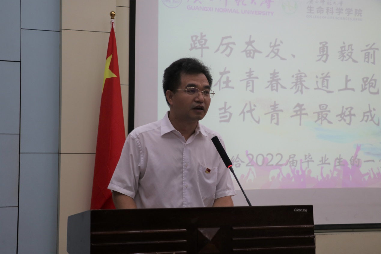 活动在庄严的国歌中拉开序幕。首先,生命科学学院院长武正军以一堂思政课的形式激励毕业生们踔厉奋发、勇毅前进,他总结和赞许了学院和同学们所取得的斐然成绩,并对风华正茂的生科学子们提出三点期许:一是收获新身份、开启新征程,要把民族复兴的使命铭记心中;二是展现新作为、彰显新担当,要把开拓创新的责任扛在肩上;三是铭记校园志、赓续校园情,要把自强不息的精神注入血脉。接着,在校生代表丁雨琲号召在校生要向优秀师兄师姐对标看齐,不断突破自我;毕业生代表张惠同学为自己是一名生科学子感到骄傲,相信不论在何地生科学子都可以熠熠生辉。