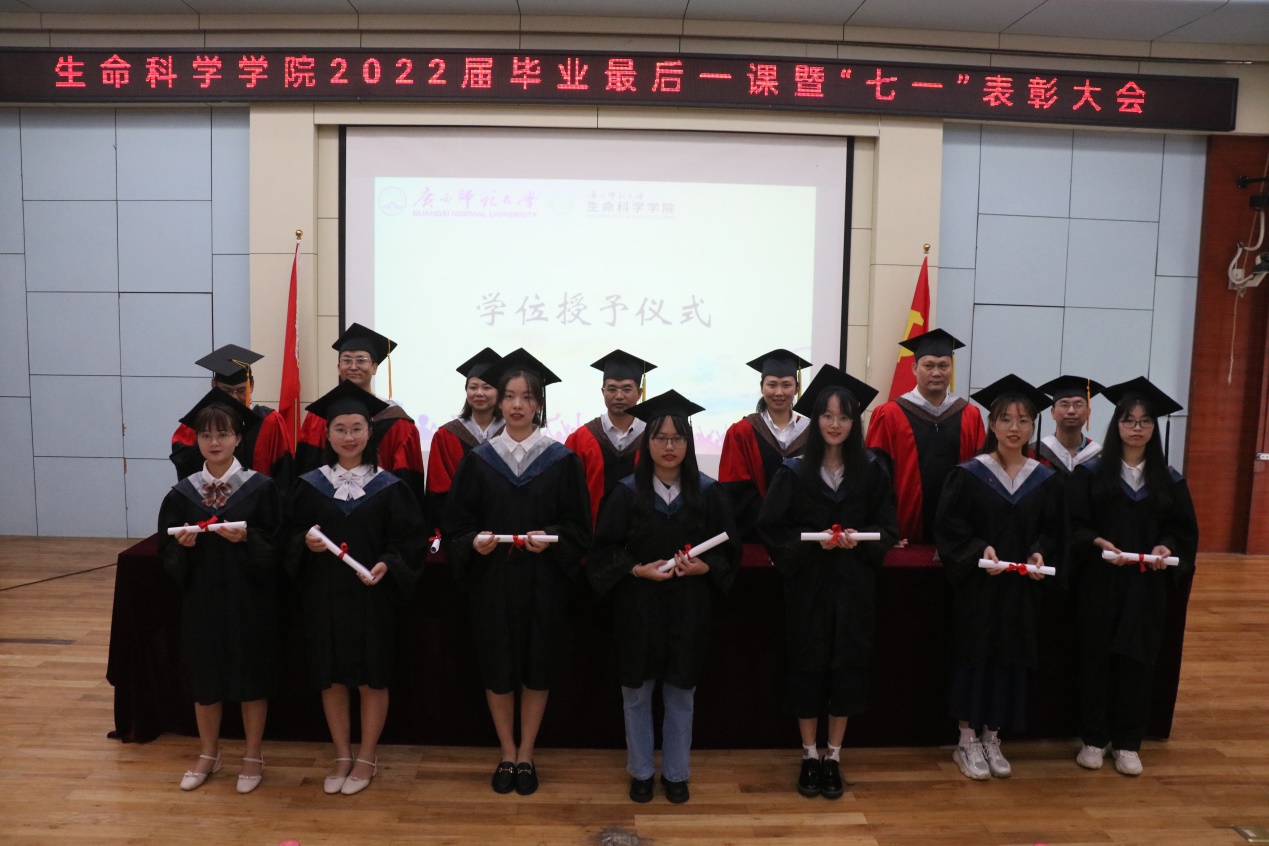 2022年6月23日上午9:30,生命科学学院在雁山校区文科楼219报告厅举行了2022届毕业最后一课暨“七一”表彰大会。本次活动由党委副书记卢洁主持,学院党委委员、学位委员会委员、“七一”表彰代表、全体专兼职辅导员、2022届本硕毕业生共同出席本次活动。
