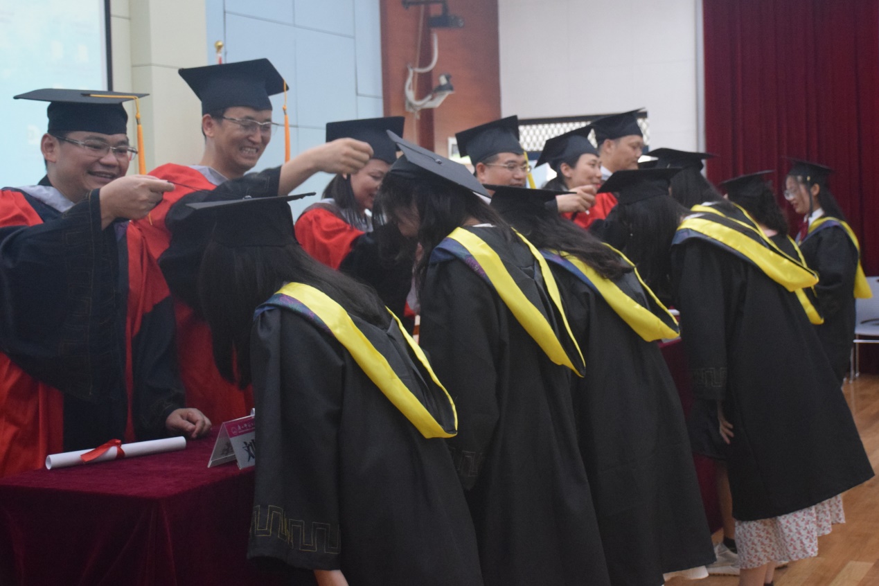 最后的学位授予仪式环节,学院学位委员会委员齐齐上台,共同为现场毕业生拨穗正冠,将学士帽的流苏从右侧拨至左侧,这是毕业学成之时,也是收获祝福之时。