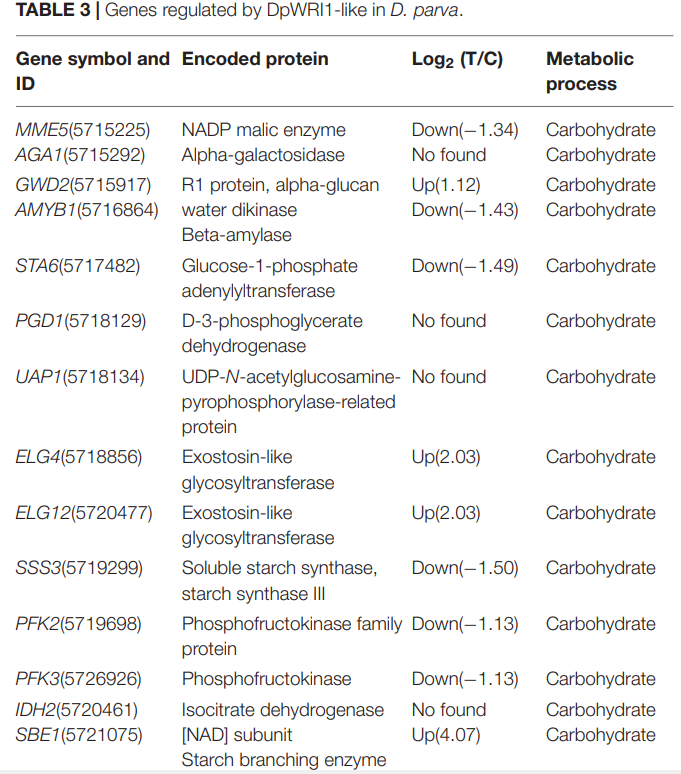 研究结果表明,DpWRI1-like的靶基因涉及糖类代谢、脂质代谢、光合作用和转录因子。本研究建立了一个DpWRI1-like调控脂质生物合成的假说。DpWRI1-like调控与糖类代谢相关的靶基因(涉及糖酵解途径、三羧酸循环、淀粉代谢),以促进糖类向脂质的转化。DpWRI1-like调控与脂质代谢相关的靶基因(特别是脂肪酸的生物合成,如KAS基因),以促进脂质的产生。本研究为进一步了解DpWRI1-like对脂质生物合成的调控机制奠定了良好的基础。