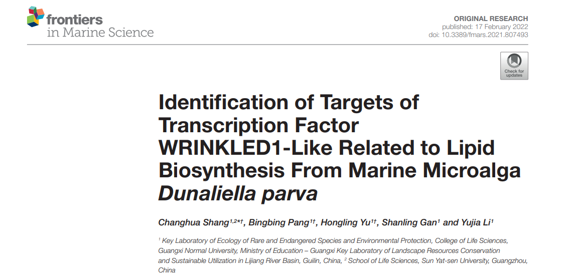2022年2月17日,生科院尚常花副教授在Frontiers in Marine Science期刊在线发表题为“Identification of Targets of Transcription Factor WRINKLED1-Like Related to Lipid Biosynthesis From Marine Microalga Dunaliella parva”的研究论文。该论文鉴定了巴夫杜氏藻WRINKLED1-like的靶基因,为深入了解巴夫杜氏藻WRINKLED1-like对脂质合成的调控机制奠定了良好的基础。论文的第一单位为广西师范大学,尚常花副教授为第一作者和通讯作者,Frontiers in Marine Science 为生物学大类中科院二区期刊。
