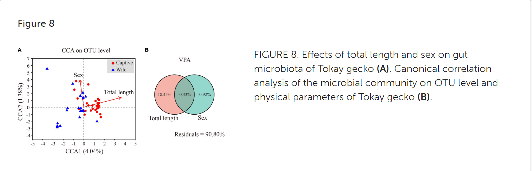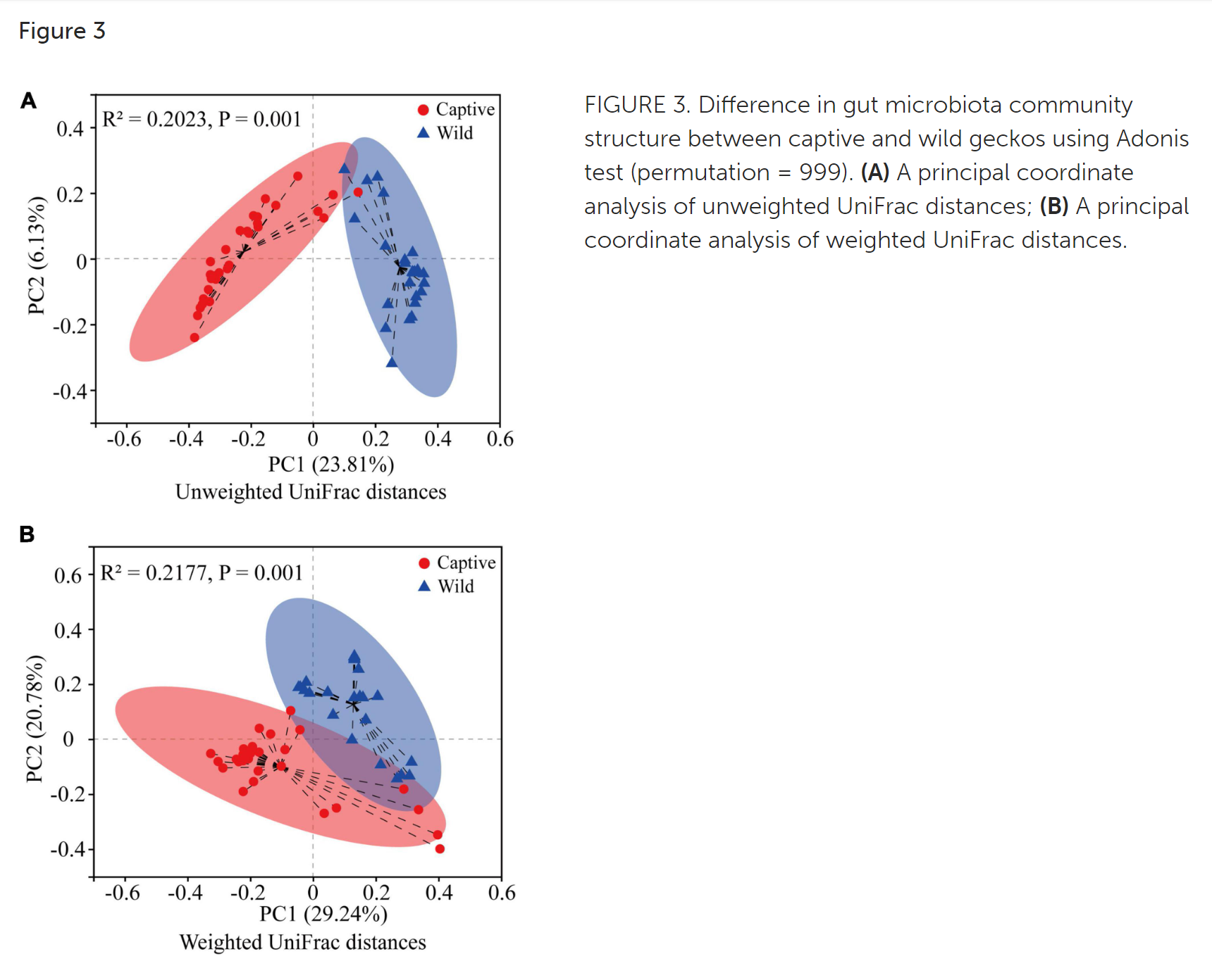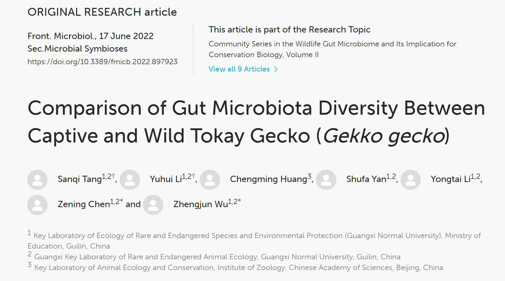 2022年6月17日,生科院武正军教授在Frontiers in Microbiology期刊在线发表题为“Comparison of Gut Microbiota Diversity Between Captive and Wild Tokay Gecko (Gekko gecko)” 的研究论文。该论文比较了野生蛤蚧与人工饲养蛤蚧在肠道菌群组成结构、多样性以及代谢通路上的差异,并探究了蛤蚧身体全长和性别对蛤蚧肠道菌群的影响。论文的第一单位为广西师范大学,唐三淇与李钰慧为共同第一作者,陈泽柠博士与武正军教授为共同通讯作者,Frontiers in Microbiology为生物学大类中科院二区期刊。
