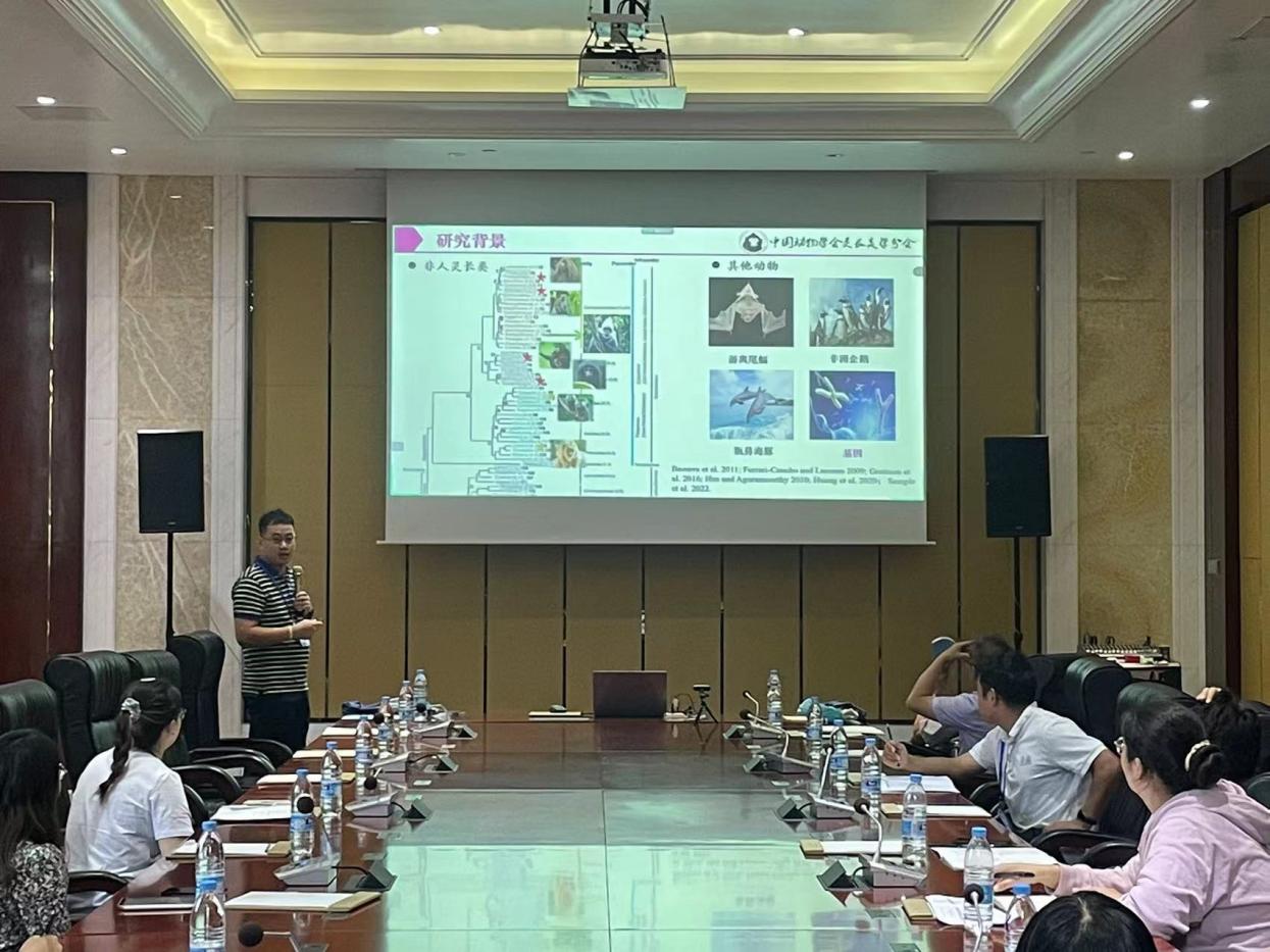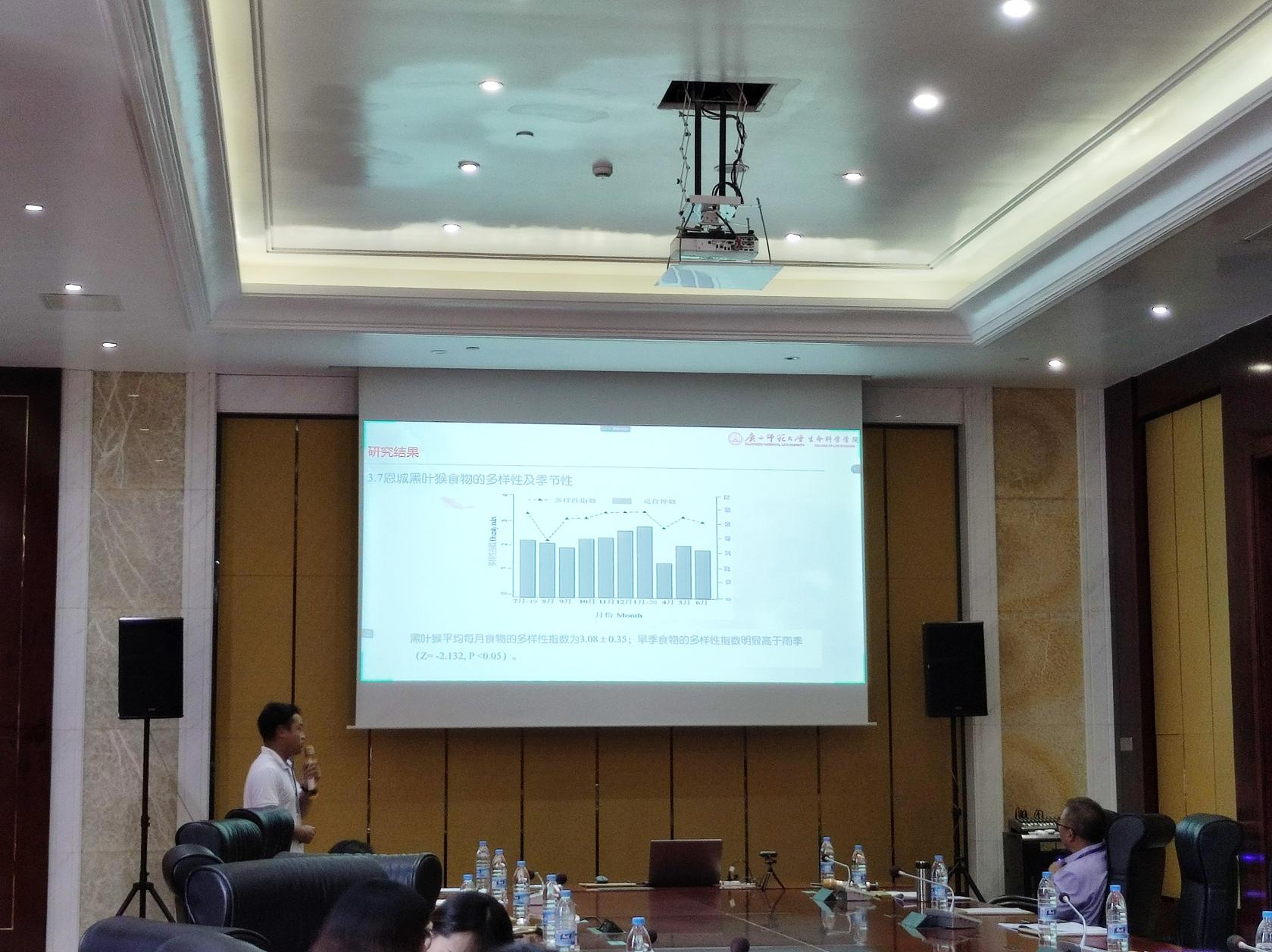 参加本次学术盛会。本次学术交流,涉及灵长类研究领域广泛,涵盖灵长类的演化与遗传、行为生理及生态、保护生物学与实验灵长类等专题。我院周岐海教授、范鹏来副教授、刘若爽博士等8名师生参会,范鹏来副教授作题为《白头叶猴的声音通讯模式:叫声类型和语图结构的适应》和《成年白头叶猴的叫声使用符合Zipf简洁定律和Menzerath定律》的两个报告,姚维作题为《广西恩城破碎化生境黑叶猴觅食策略》的报告。