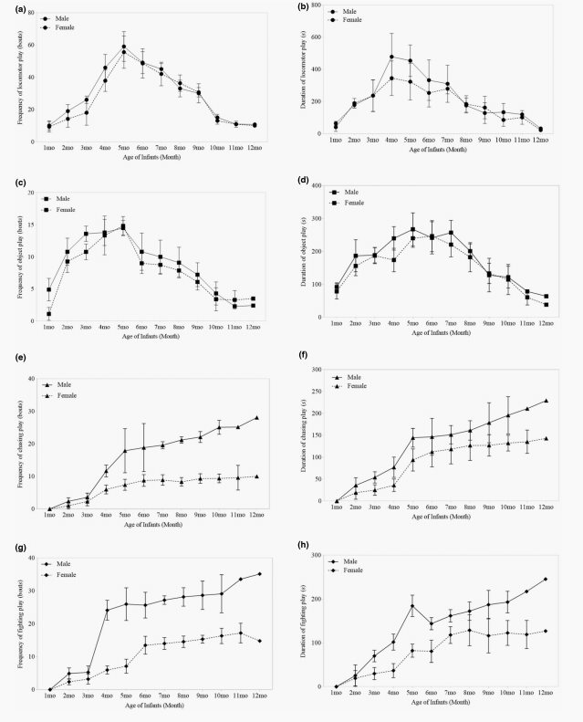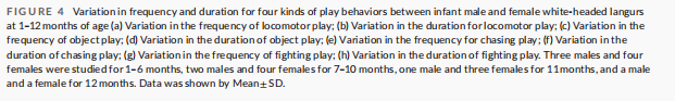 研究发现,不同年龄性别的婴幼白头叶猴表现出不同的玩耍行为模式。具体而言,婴幼白头叶猴在1月龄时出现非社会性玩耍,2月龄时出现社会性玩耍,3月龄时两种玩耍行为逐渐增加。其中,非社会性玩耍的频次和持续时长在5月龄达到峰值,之后逐渐下降;而社会性玩耍的频次和持续时长则随着年龄的增长而逐渐增加。非社会性玩耍在不同性别间无显著差异;而社会性玩耍却表现出明显的性别特异性,与雌性幼猴相比,雄性幼猴的社会性玩耍频次更高,持续时间更长。此外,雄性和雌性白头叶猴幼崽似乎更喜欢同性别个体作为玩耍伙伴,但对特定个体没有明显的选择偏好。本研究认为,婴幼个体玩耍行为的年龄和性别差异构成了成年叶猴社会交往中年龄和性别差异的基础。