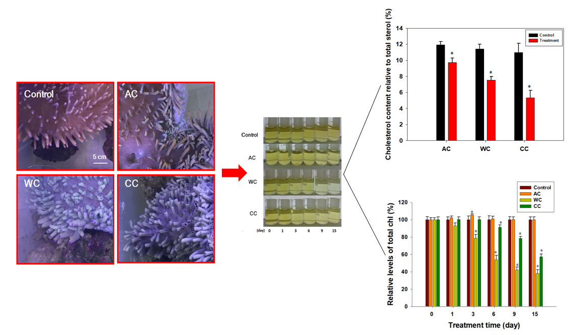 研究显示,共生虫黄藻叶绿素水平的上升可能是海葵适应海洋酸化的重要方式,海水温度上升是导致海葵白化的主要原因。共生虫黄藻甾体合成,特别是胆固醇的合成可以作为评价海葵(珊瑚)健康的重要标志性代谢物。研究结果为了解海洋生物适应气候变化机制提供参考。相关研究成果“Adaptive Responses of the Sea Anemone Heteractis crispa to the Interaction of Acidification and Global Warming”在线发表在《Animals》上,吴扬扬(2021级硕士研究生)为论文第一作者,程春醒(2020级硕士研究生)参与了此项工作,蒋骄云博士为通讯作者(Wu, Y.Y., Tian, W.F., Chen, C.X., Ye, Q.Q., Yang, L., Jiang, J.Y*. Animals 2022, 12(17), 2259; https://doi.org/10.3390/ani1 2172259)。