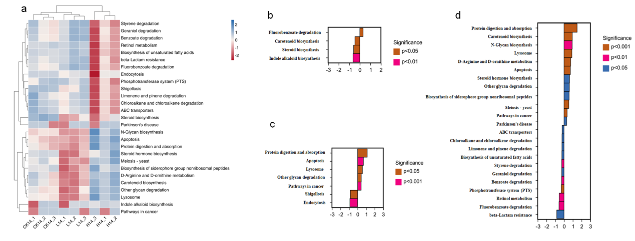 研究显示,高温引起中华圆田螺肠道菌群结构发现显著变化,潜在的益生菌(Pseudomonas, Aeromonas, Rhodobacter, and Bacteroides)丰度下降,而致病菌丰度上升(Halomonas)。通路分析显示,大部分显著富集通路与疾病相关。本研究初步揭示了不同生存温度对中华圆田螺肠道菌群的影响,为中华圆田螺养殖产业的健康发展提供重要参考。相关研究成果“Characterization of gut microbiome in the mud snail Cipangopaludina cathayensis in response to high-temperature stress”发表在《Animals》上,吴扬扬(2021级硕士研究生)和程春醒(2020级硕士研究生)为论文共同第一作者,蒋骄云博士为通讯作者(Wu, Y.Y﹟., Chen, C.X﹟., Yang,L., Ye, Q.Q., Li, W.H., Jiang, J.Y*. Animals 2022, 12(18), 2361; https://doi.org/10.3390/ani12182361)。