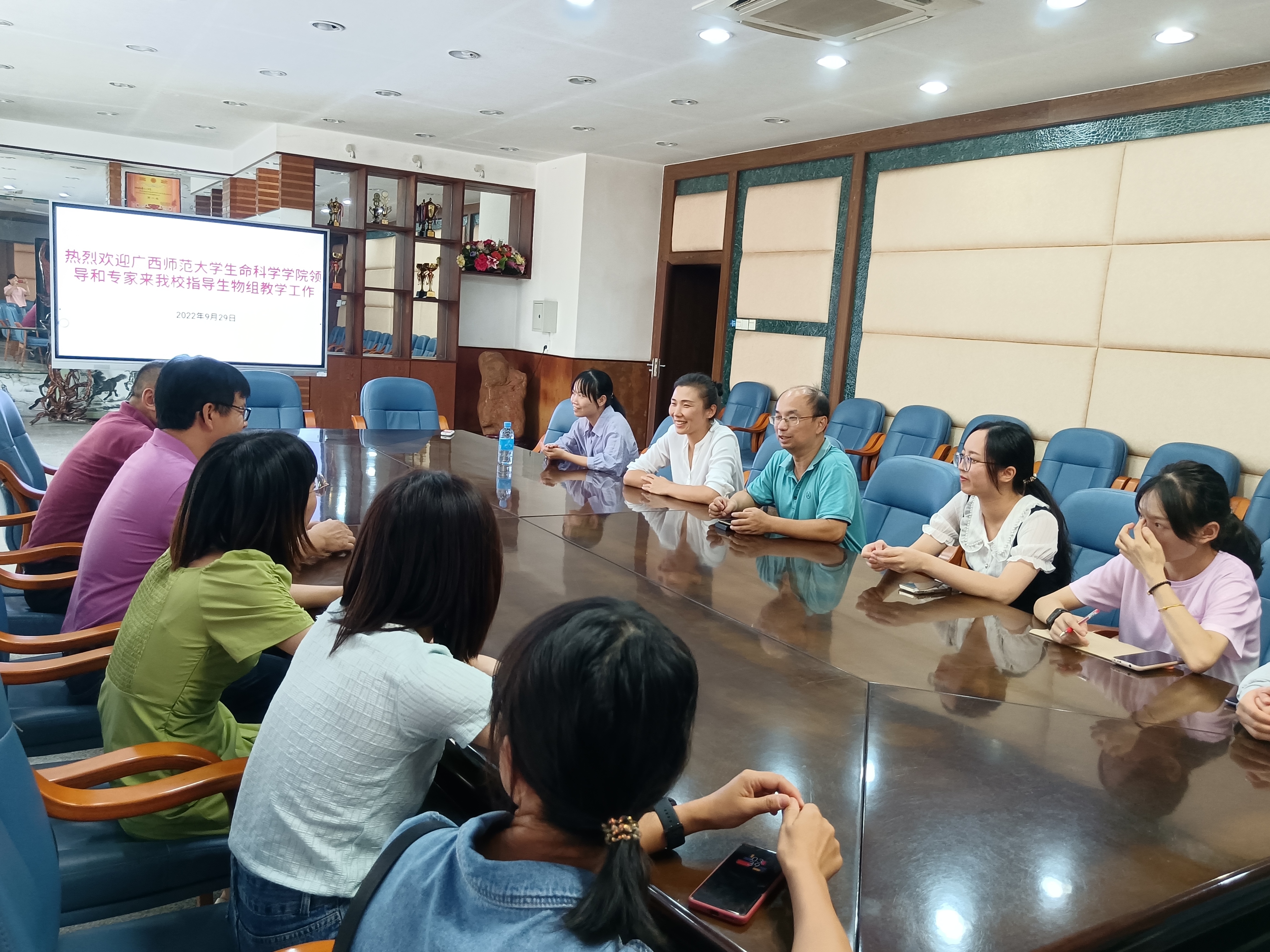 座谈会上,孙涛书记向桂林市第十八中学生物组的教师和校友们表达了亲切的问候,并介绍了生命科学学院建设情况和师资力量,以及珍稀濒危动植物生态与环境保护教育部重点实验室的教学资源,谈到了科普进校园活动的开展情况等。会议上双方就生物学科建设和教师队伍培养等方面进行了详细交流。广西特级教师刘诚宽老师在会上分享了在生科院任教的经历,教导生物组青年教师加强专业学习,希望借助生科院平台和实验室资源,带领青年教师到高校进行生物实验培训,提高青年教师专业素养和实验操作能力。