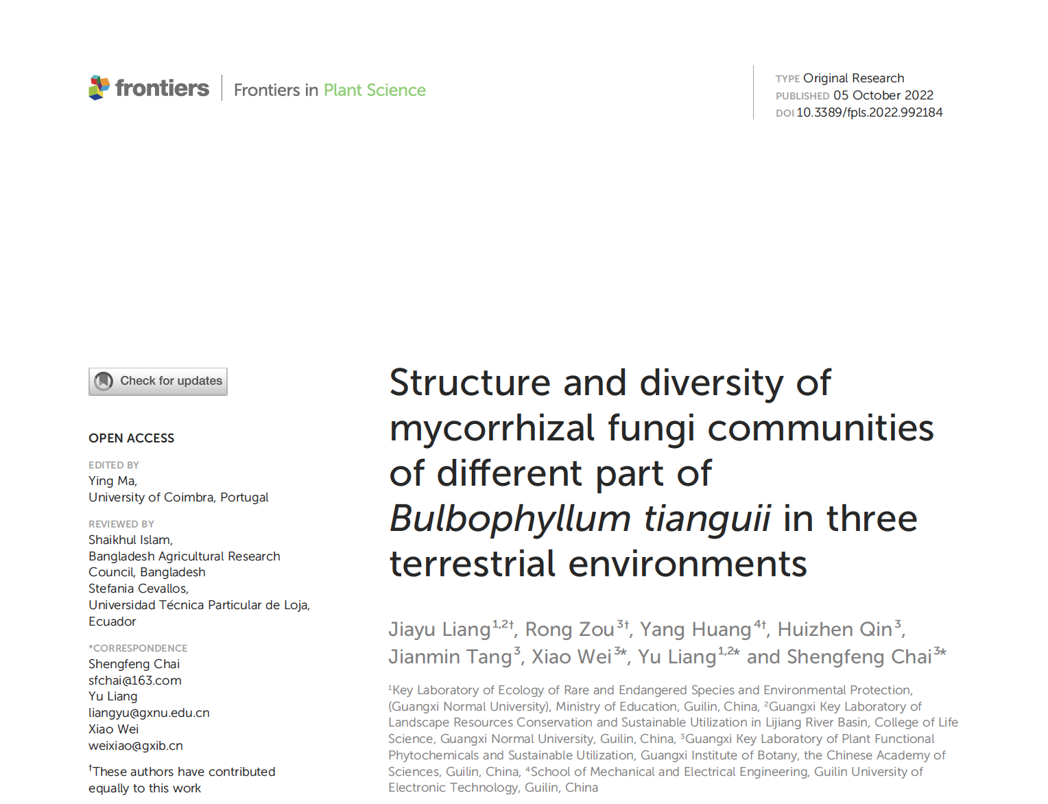 近日,生科院青年教师梁语博士在国际学术期刊Frontiers in plant science发表了题为“Structure and diversity of mycorrhizal fungi communities of different part of Bulbophyllum tianguii in three terrestrial environments”的研究论文。该研究揭示了天贵卷瓣兰根和根际土壤中的菌根真菌多样性。我校为该论文的第一单位,我院2020级生物学硕士研究生梁嘉瑜为共同第一作者,我院青年教师梁语博士为通讯作者,中国科学院广西植物研究所柴胜丰老师、韦霄老师为共同通讯作者。