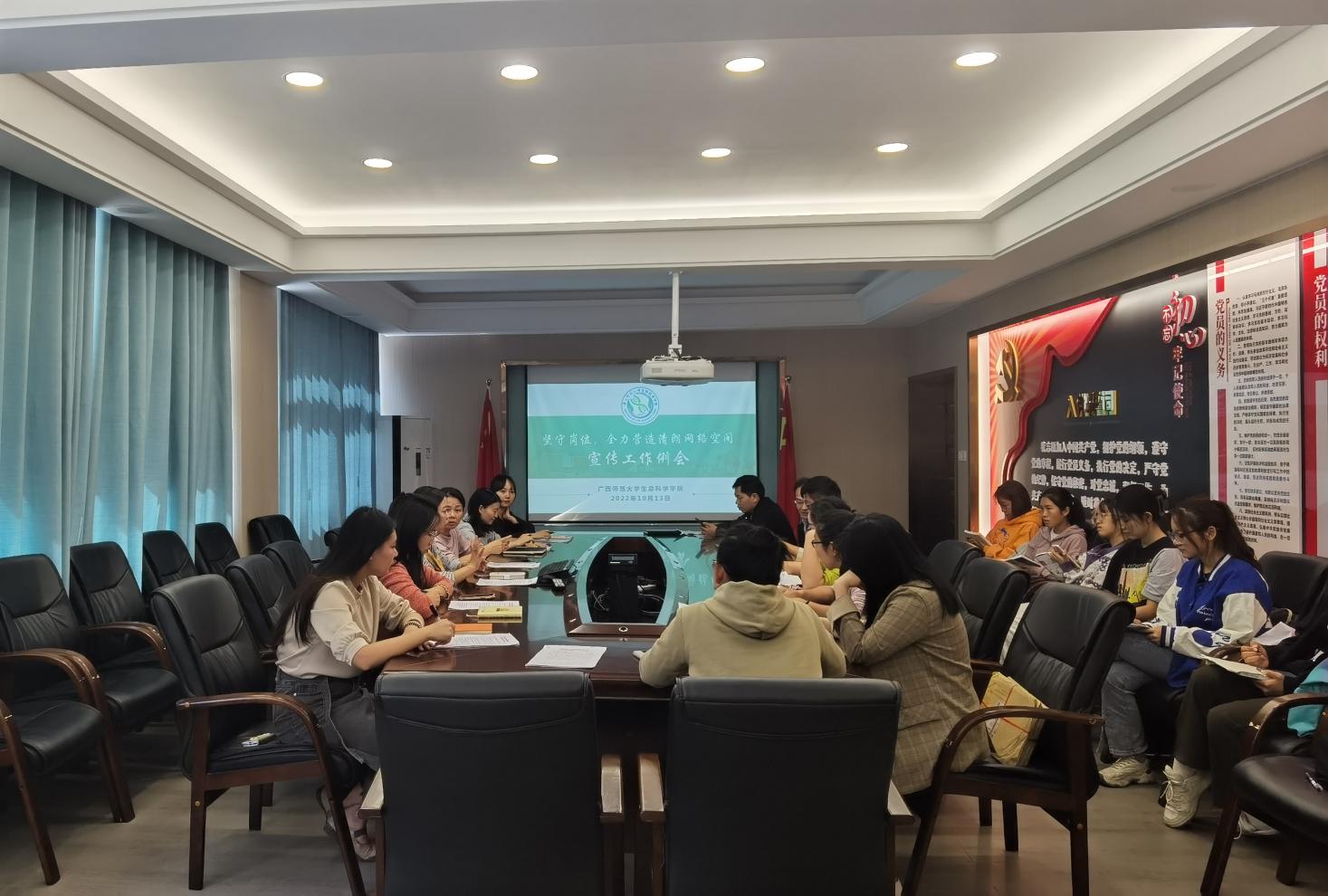 为聚力营造清朗网络空间,扎牢织密网络安全屏障,2022年10月13日中午,生命科学学院于党员之家召开“坚守岗位,全力营造清朗网络空间”专题宣传工作例会。学院党委副书记卢洁、党支部书记、教学秘书、院办新闻专员及学院各平台管理老师出席本次会议,生命科学学院新媒中心学生负责人共同参加。会议由学院团委副书记秦乐主持。