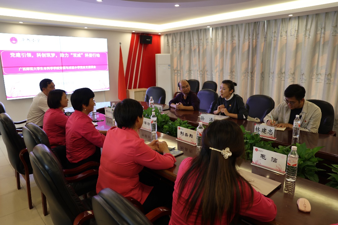为全面落实教育部、中国科协关于利用科普资源助推“双减”工作部署,积极发挥高校的社会服务职能,2022年10月17日,生命科学学院党委与桂林市卓然小学党总支开展了以“党建引领,科创筑梦,助力‘双减’科普行动”为主题的党建共建交流活动。生命科学学院党委书记孙涛、珍稀濒危动植物生态与环境保护教育部重点实验室常务副主任周岐海、生物多样性博物馆馆员林建忠、及卓然小学党总支书记、校长叶琴珍带领全体班子成员共同参加了会议。