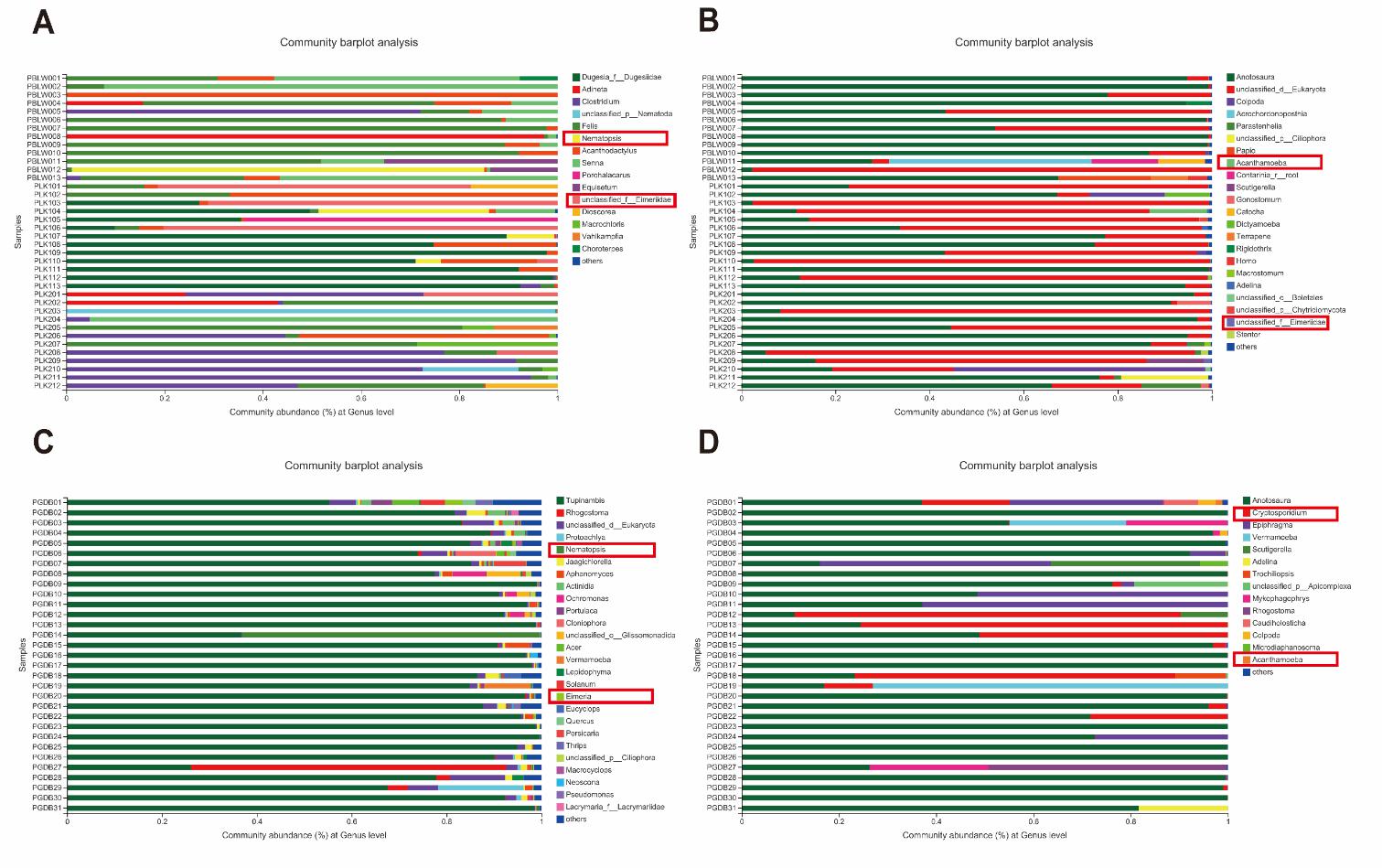 研究结果显示,在69个鳄蜥样本中检测到23个寄生虫阳性样本,总寄生感染率为33.33%(23/69)。在样本中发现了四种寄生虫,包括Cryptosporidium、Eimeria、Nematopsis和Acanthamoeba。结果表明,圈养种群的寄生虫感染率明显高于野生种群,这说明圈养鳄蜥比野生鳄蜥更容易感染寄生虫病,值得进一步关注。此外,只有隐孢子虫感染在大桂山和罗坑之间存在显著差异,来自大桂山的鳄蜥对隐孢子虫的感染表现出更高的敏感性。从疾病预防的角度来看,这些发现对鳄蜥的保护具有重要意义。