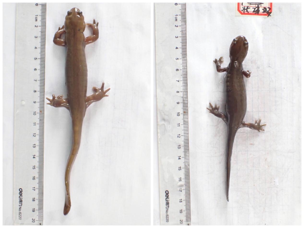 图1猫儿山小鲵的两性异形整体视图。雄性(左)和雌性(右)。