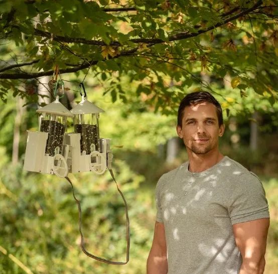 Josh Firth in Wytham Woods, Oxford, with two RFID-controlled automated bird feeders