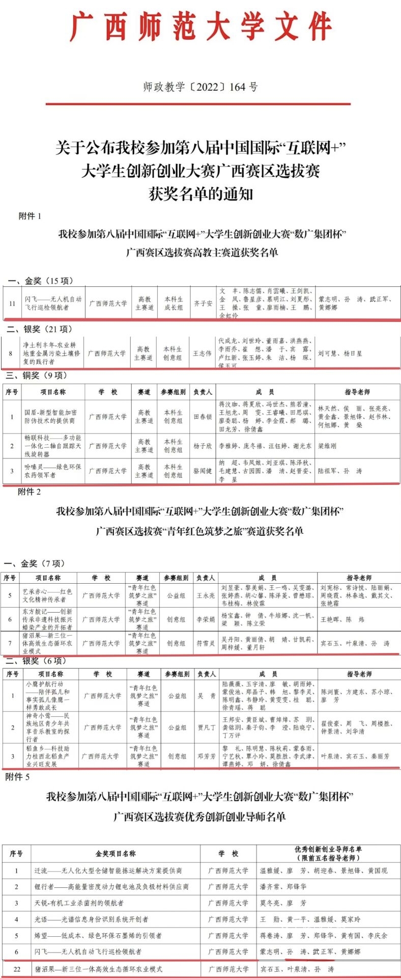近日,第八届中国国际“互联网+”大学生创新创业大赛广西赛区选拔赛在桂林理工大学圆满落下帷幕。我院师生再创佳绩,选送的5个项目均获奖项,其中高教主赛道获得金奖1项、银奖1项、铜奖1项,“青年红色筑梦之旅”赛道获得金奖1项、银奖1项;1项金奖项目推荐参加全国总决赛。