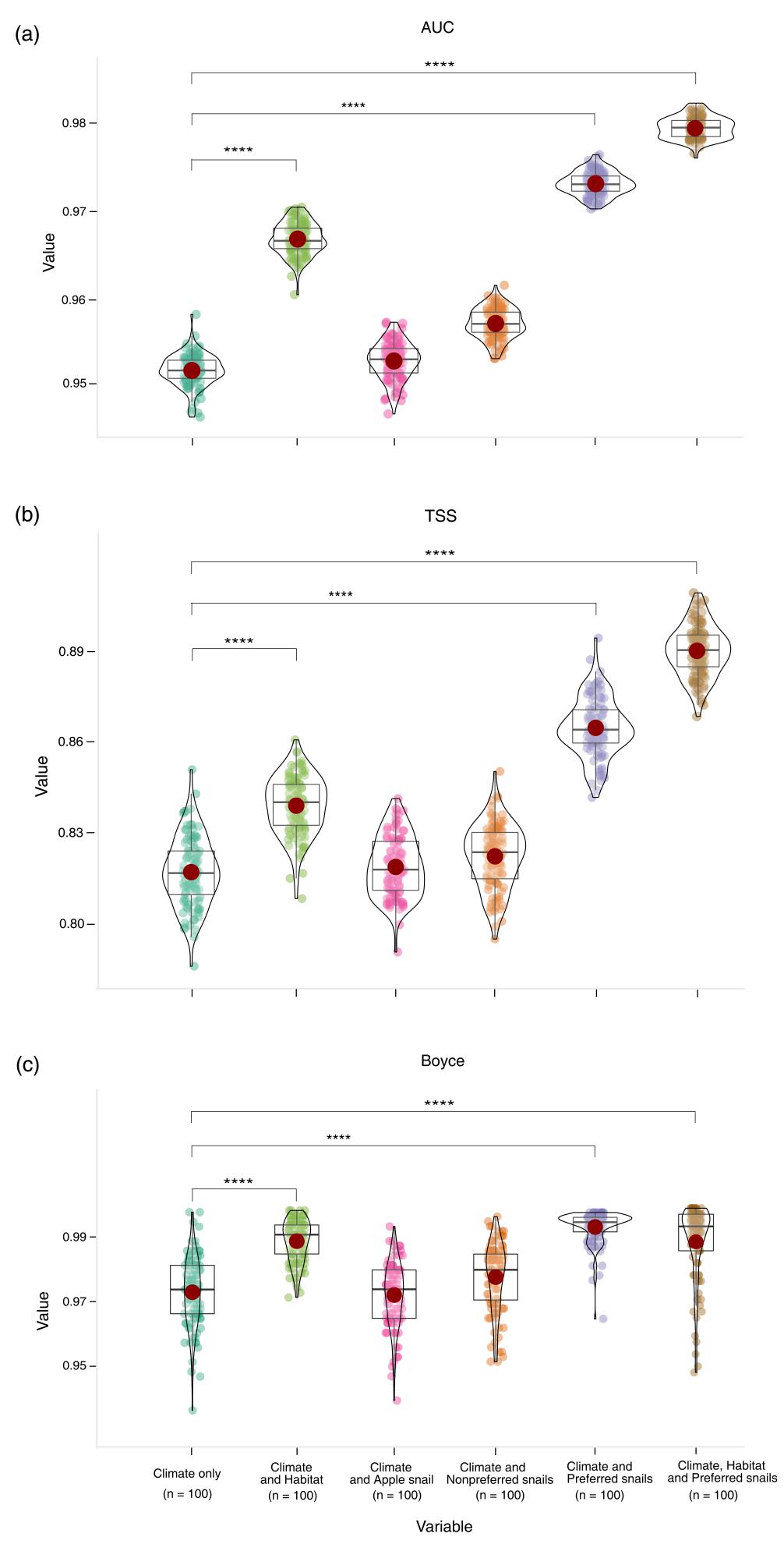 研究结果支持了我们的理论预测:即当仅考虑气候变量时,我们确实观察到了钳嘴鹳在北扩过程中发生了真实气候生态位漂移。然而,当我们加入了福寿螺等钳嘴鹳喜食螺后,钳嘴鹳的生态位扩张占比降低50%以上,即真实生态位更加趋于保守(图2),同时我们也发现包含喜食螺的生态位模型也比仅考虑气候、厌食螺或栖息地变量时能够更加准确的预测钳嘴鹳的分布区(图3)。这些研究结果表明,纳入捕食互作因素尤其是物种捕食偏好性后,能有助于更加客观和准确的理解物种分布区变化时的生态位保守性,并在此基础上开展更加准确的潜在适生区预测。这提示我们,在当今全球变化背景下,捕食偏好性对发展更加准确的预测本土种分布区变化和外来种早期入侵风险具有重要作用,可有助于当地物种保护策略和外来入侵物种管控策略的发展。