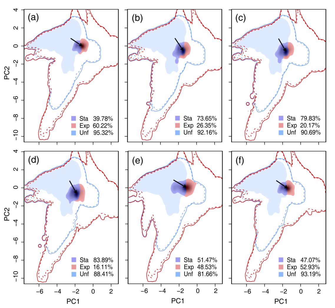 图2 不同预测变量组合下的钳嘴鹳生态位动态 (a)仅气候;(b)气候+福寿螺;(c)气候+喜食螺;(d)气候+喜食螺和水生栖息地;(e)气候+非偏爱螺;(f)气候+水生栖息地。
