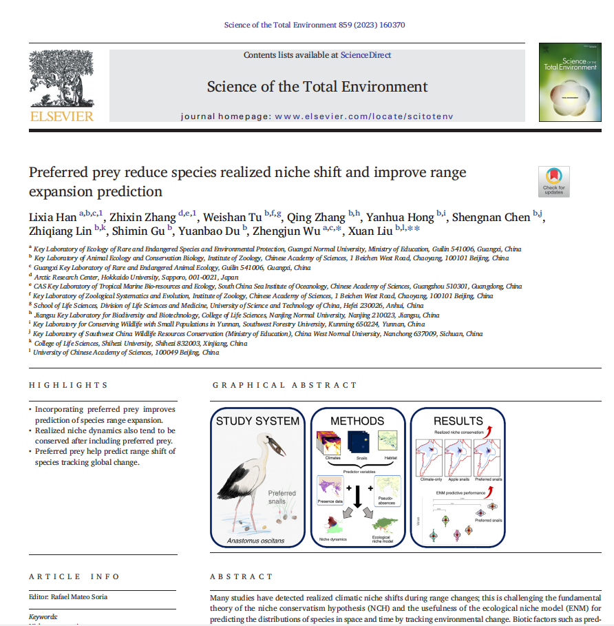 该项研究成果近日以“Preferred prey reduce species realized niche shift and improve range expansion prediction”为题发表于国际学术期刊《Science of the Total Environment》。我院与中科院动物所联合培养硕士研究生韩丽霞和北海道大学(现工作单位中科院南海海洋研究所)张志新博士为共同第一作者,中科院动物所刘宣研究员和我院武正军教授为共同通讯作者。本研究得到教育部珍稀濒危物种生态与环境保护重点实验室(广西师范大学)、国家自然科学基金、中国科学院青年创新促进会和第三次新疆综合科学考察等项目支持。