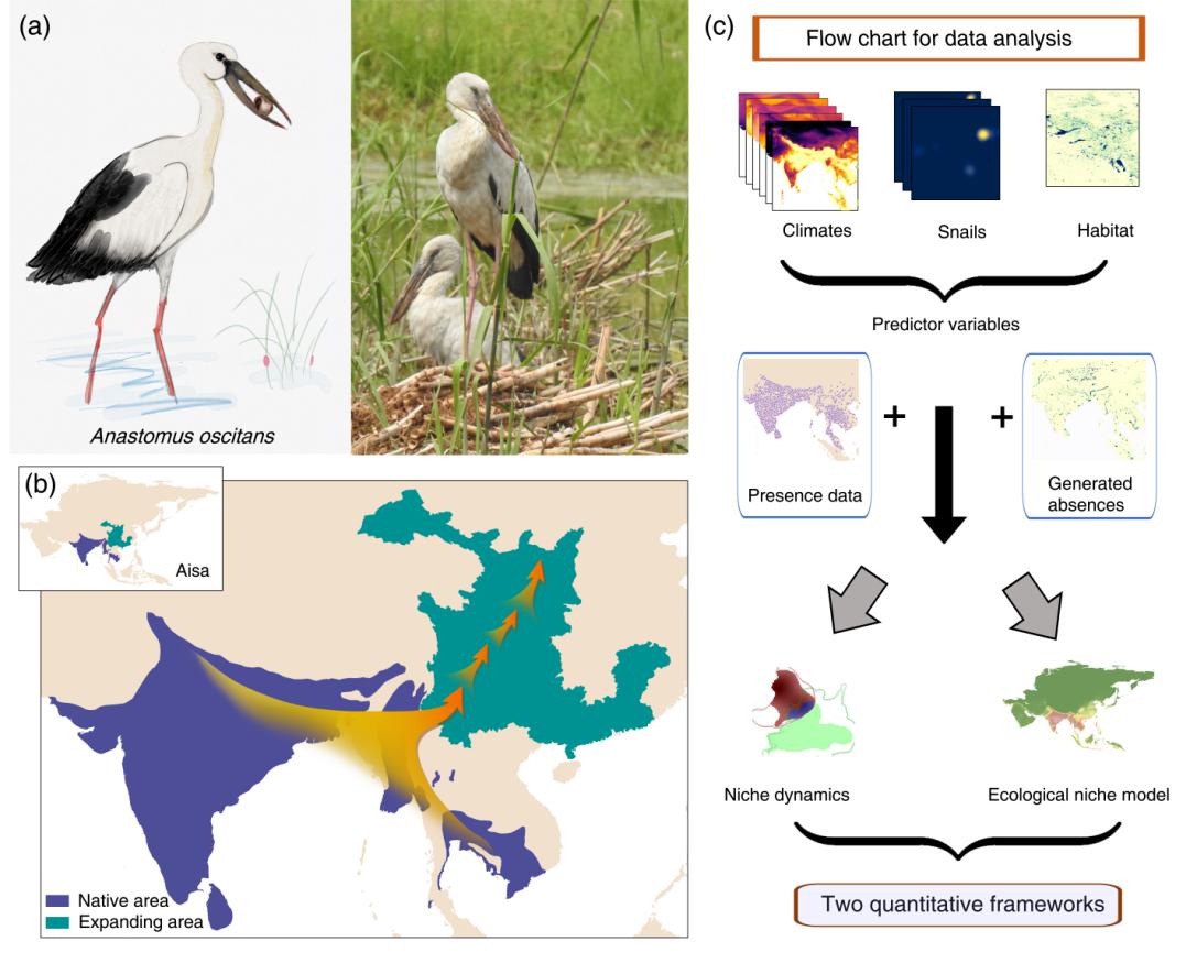 主要历史分布区在东南亚和南亚,但近年来在我国正在经历快速北扩的大型热带水鸟——钳嘴鹳(Anastomus oscitans),因其如长嘴钳子一般的特殊喙形,主要以螺蚌类等软体动物为食,尤其偏爱以外来入侵物种福寿螺为代表的部分螺类,这为我们探讨捕食偏好性在物种分布区变化中的作用提供了难得的机会。理论预测,气候、水源等基础生态位因素在考虑食物因素特别是喜食性物种后,钳嘴鹳北扩过程的真实生态位将更加趋于保守,同时也可能会产生更加准确的潜在适生区预测。据此,武正军教授团队与中国科学院动物研究所刘宣研究员团队合作,通过野外调查和系统性资料收集,以钳嘴鹳及其136种捕食性螺类为研究对象,在气候、气候和喜食螺、气候和厌食螺、气候和水生栖息地、气候和喜食螺及栖息地等不同变量组合下,全面探索了钳嘴鹳北扩过程中的真实生态位保守性和分布区预测准确性(研究框架见图1)。