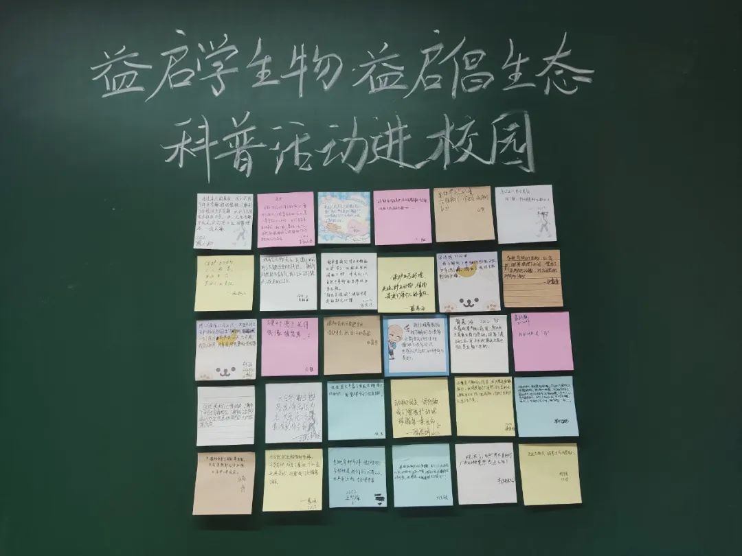 展板上列出的形形色色的生物,大多数为稀有物种或是国家重点保护对象,培养学生树立正确的生命观念同时,也在渗透着要懂得保护自然,尊重自然的真谛。随后,学生们相互讨论各抒己见,在看中学、在学中悟,并纷纷用小纸条写下自己的感悟,表达对自然科学敬重以及生物学习的热忱。