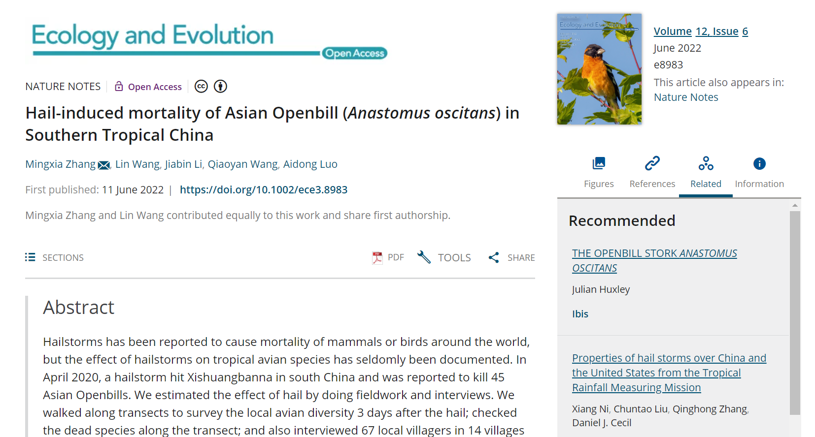 该研究成果以“Hail-induced mortality of Asian Openbill (Anastomus oscitans) in Southern Tropical China”为题发表在国际学术期刊Ecology and Evolution上(https://doi.org/10.1002/ece3.8983)。我院张明霞博士为共同第一作者和通讯作者,中国科学院西双版纳热带植物园王林副研究员为共同第一作者。该研究获得了国家自然科学基金(31872963),环保部生物多样性优先区域调查与评估项目(2019-2-4)、广西科技与人才专项项目(2021AC19106)和教育部珍稀濒危物种生态与环境保护重点实验室(广西师范大学)等基金的支持。