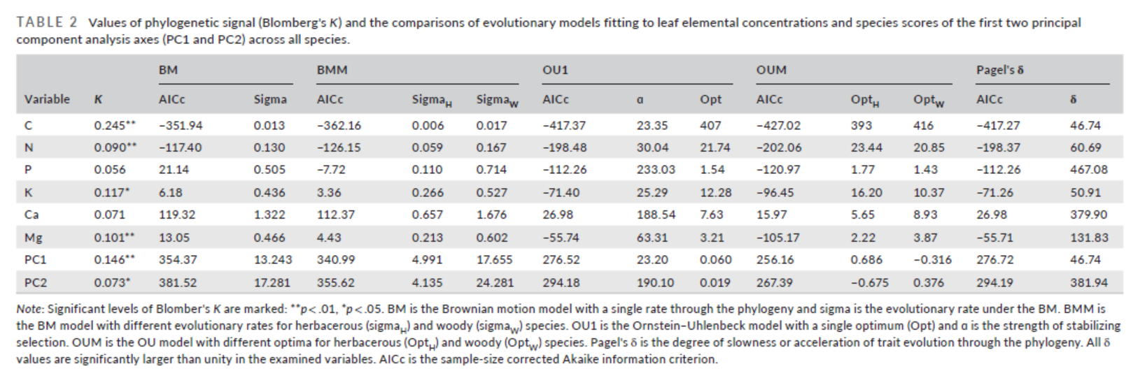 表2 植物叶片元素含量及其主成分分数的系统发育信号和进化模型比较