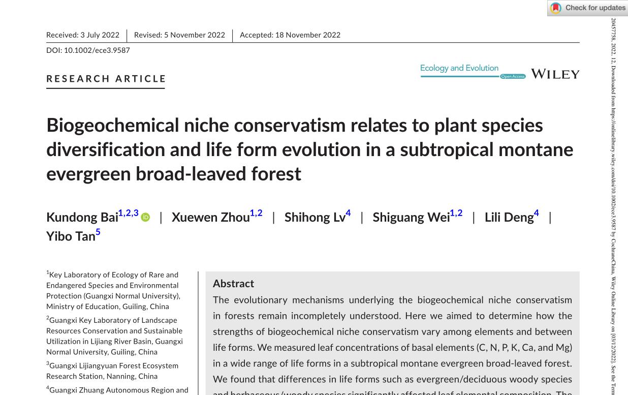 该研究成果以“Biogeochemical niche conservatism relates to plant species diversification and life form evolution in a subtropical montane evergreen broad- leaved forest”为题发表在国际学术期刊Ecology and Evolution上(https://onlinelibrary.wiley.com/doi/10.1002/ece3.9587)。我院白坤栋研究员为第一作者和通讯作者。该研究获得了国家自然科学基金(31960214)、广西自然科学基金(2020GXNSFBA297153)、教育部珍稀濒危物种生态与环境保护重点实验室和广西漓江流域景观资源保育与可持续利用重点实验室的支持。