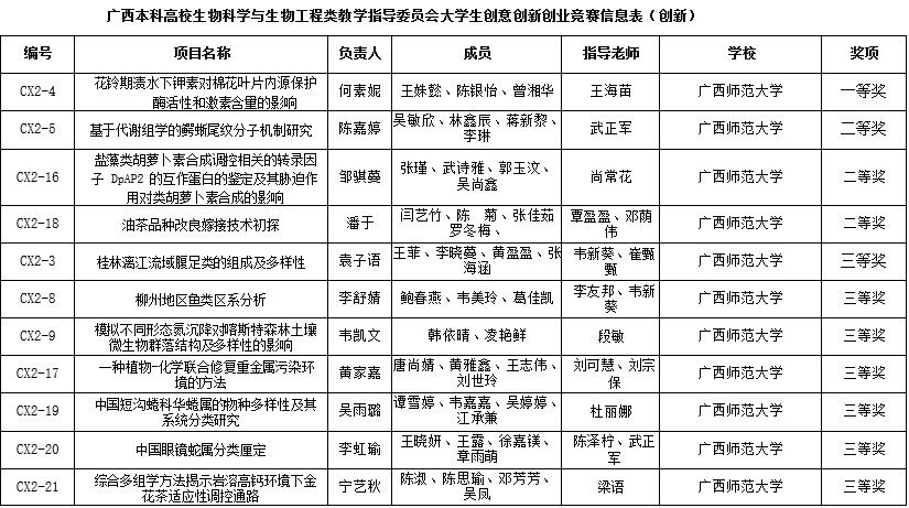 在创业赛道中,项目《立体教材知识,趣味科普动物》、《“生物+”》荣获一等奖,《慧行研学促成长,寓教于乐悟真知》等4项荣获二等奖,《“那有条蛇”蛇类识别小程序》等5项荣获三等奖;在创新赛道中,项目《花铃期渍水下钾素对棉花叶片内源保护酶活性和激素含量的影响》荣获一等奖,《基于代谢组学的鳄蜥尾纹分子机制研究》等3项荣获二等奖,《桂林漓江流域腹足类的组成及多样性》等7项荣获三等奖;在创意赛道中,项目《八桂风情》、《十年辉煌》荣获一等奖,《宏微生命之彩》等5项荣获二等奖,《夸父逐日》等6项荣获三等奖。