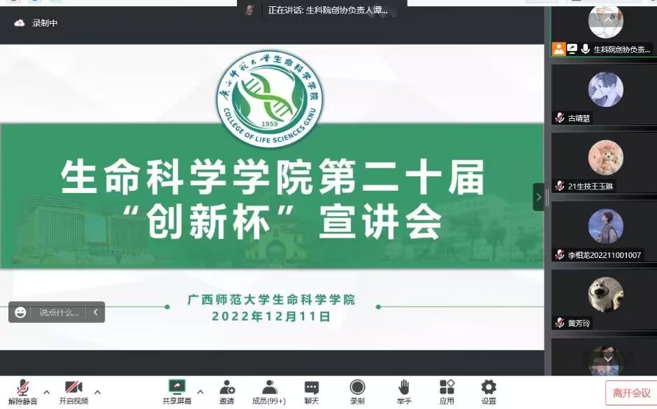 为进一步培养学生创新思维和创业意识,促进创新竞赛、创业实践的积极开展,2022年12月11日下午,生命科学学院以线上线下相结合的形式开展第二十届“创新杯”竞赛宣讲会。线下在理科楼四区304教室开展,线上在腾讯会议同步进行。会议由学院创新创业协会会长主持,各年级本科生及研究生共500余人线上线下共同参加。