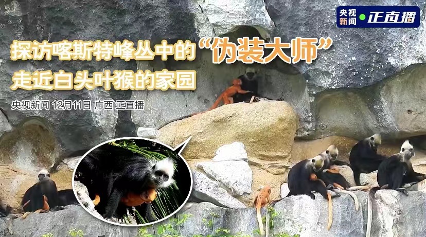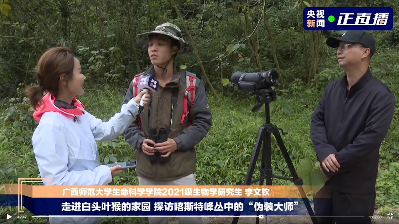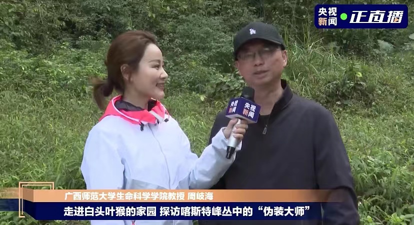12月11日,央视新闻正直播栏目携手广西崇左白头叶猴国家级自然保护区推出白头叶猴主题直播活动《探访喀斯特峰丛中的“伪装大师”,走近白头叶猴的家园》,带领广大观众开启了一场与众不同的“云探访”。我校生命科学学院周岐海教授和2021级生物学硕士研究生李文钦作为嘉宾受邀参与本次野外现场直播节目,一起走进广西崇左白头叶猴国家级自然保护区,探访这些可爱的“石山精灵”,讲述白头叶猴的研究与保护的故事。