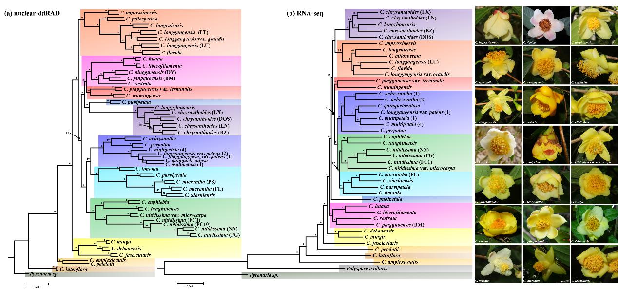 2022年9月,生命科学学院唐绍清教授课题组在国际学术期刊《Journal of Systematics and Evolution》(中科院一区TOP期刊(2021年))发表题为“Using phylogenomics to untangle the taxonomicincongruence of yellow‐flowered Camelliaspecies(Theaceae) in China”的最新研究成果。该文章完成了我国分布的全部金花茶植物的转录组、简化基因组以及叶绿体基因组小单拷贝区测序。