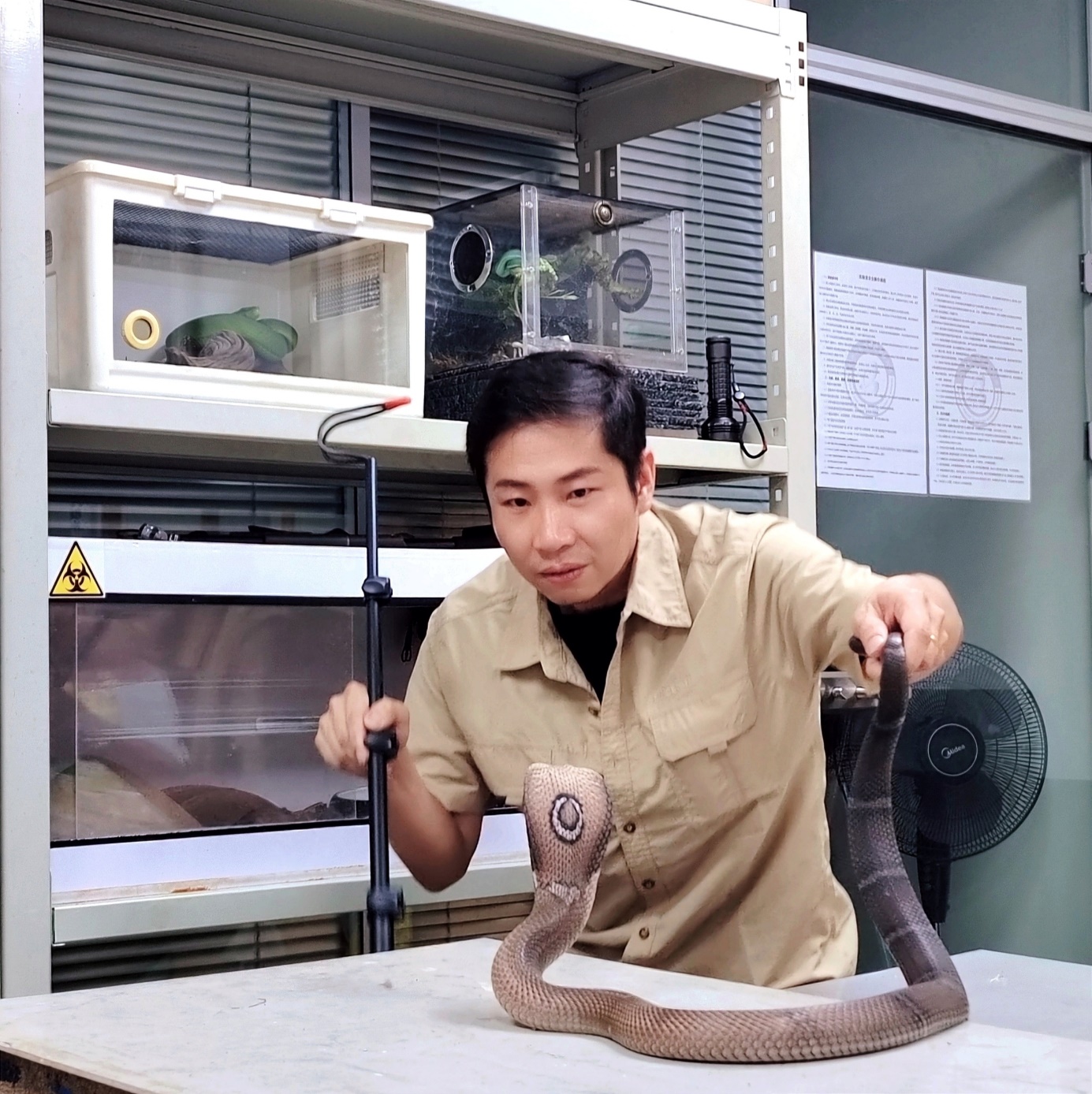 图4 张亮在展示西南眼镜蛇体背斑纹和颈背图案