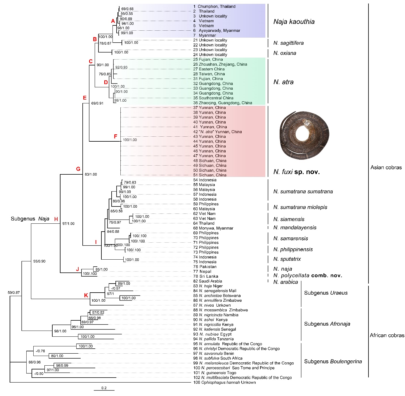 图3 基于线粒体cyt b 和ND4基因重构的眼镜蛇属Naja 系统发育树 图片引自(Shi et al., 2022)