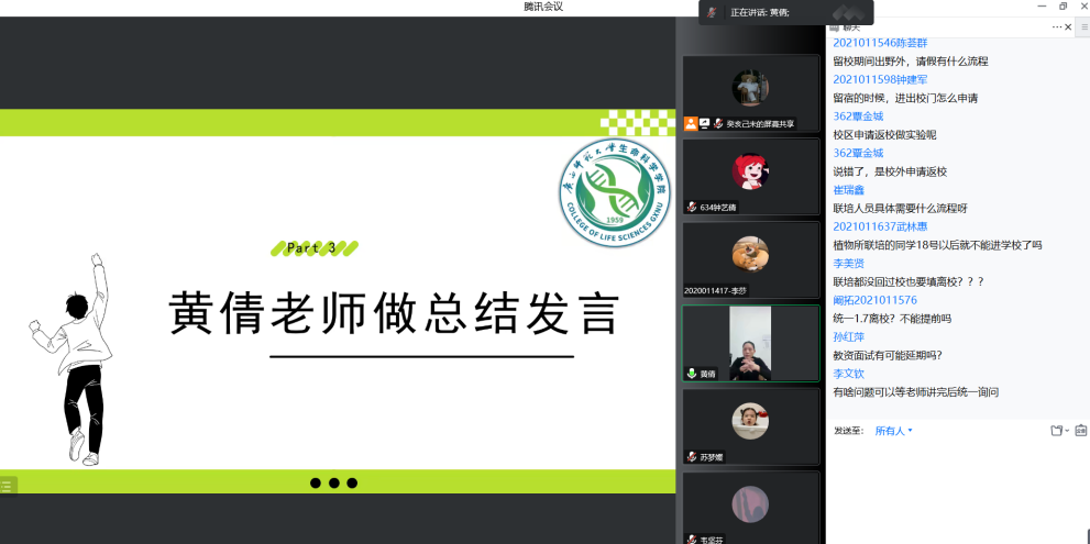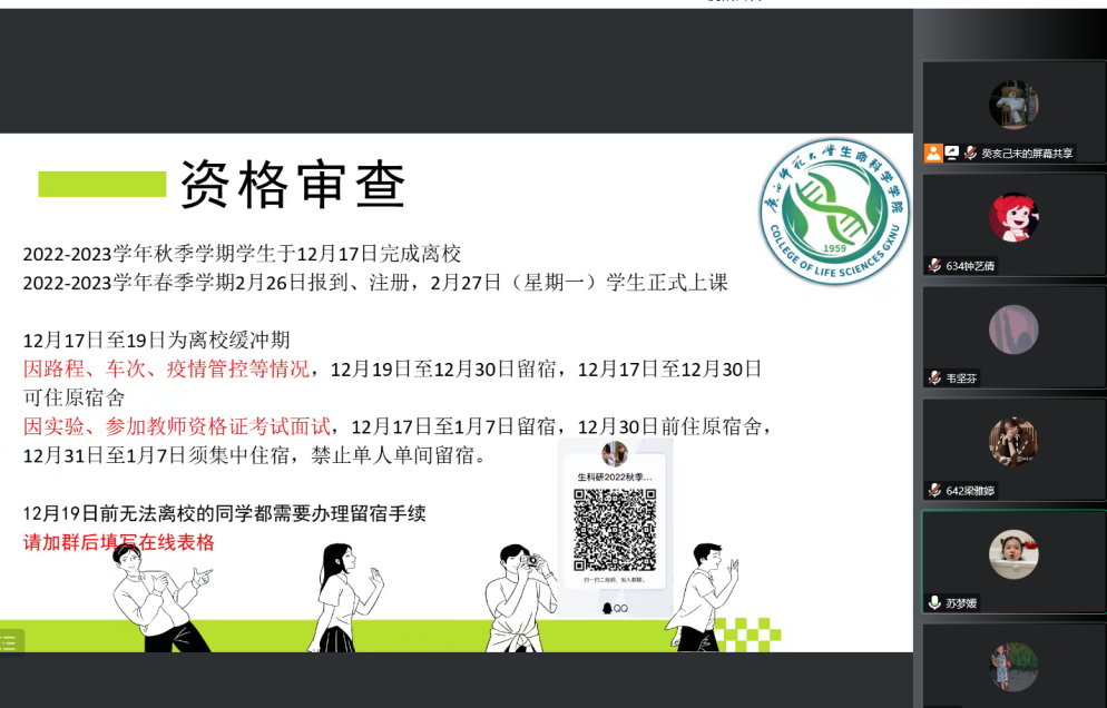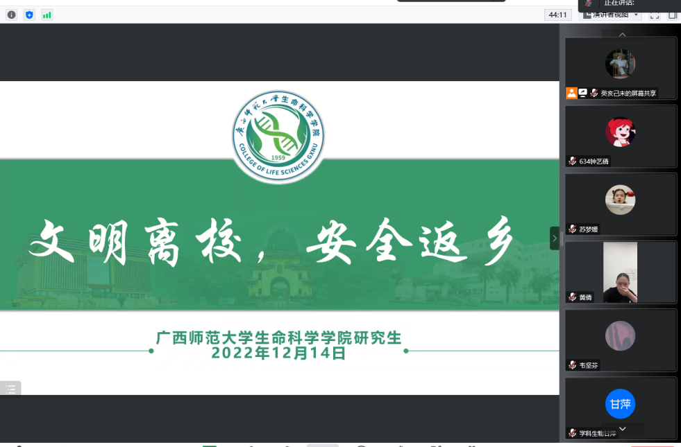 学期即将结束,寒假将至,为切实增强学生离校安全防范意识,确保学生有序离校,让同学们度过一个安全愉悦的假期,2022年12月14日晚19:00,生命科学学院研究生于线上开展“文明离校,安全返乡”离校教育主题班会,此次会议由专职辅导员黄倩老师主持,兼职辅导员苏梦媛和全体研究生共同参与。