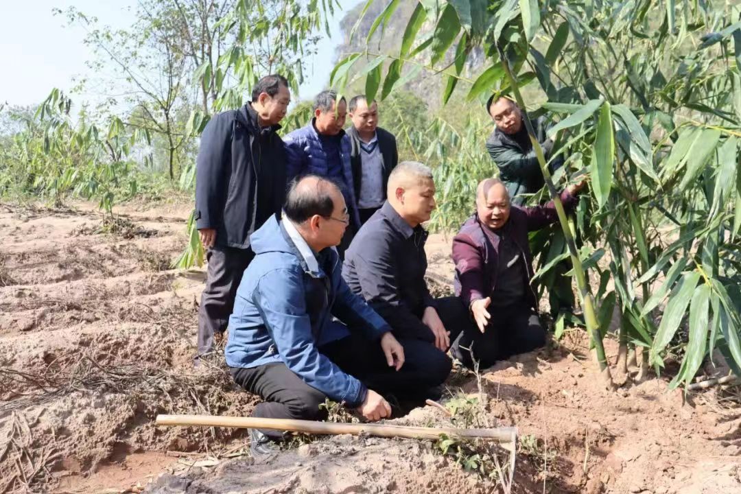 图3: 金宝乡党委书记倪发军(前左2)在笋用竹栽培示范基地认真学习其高产栽培技术。