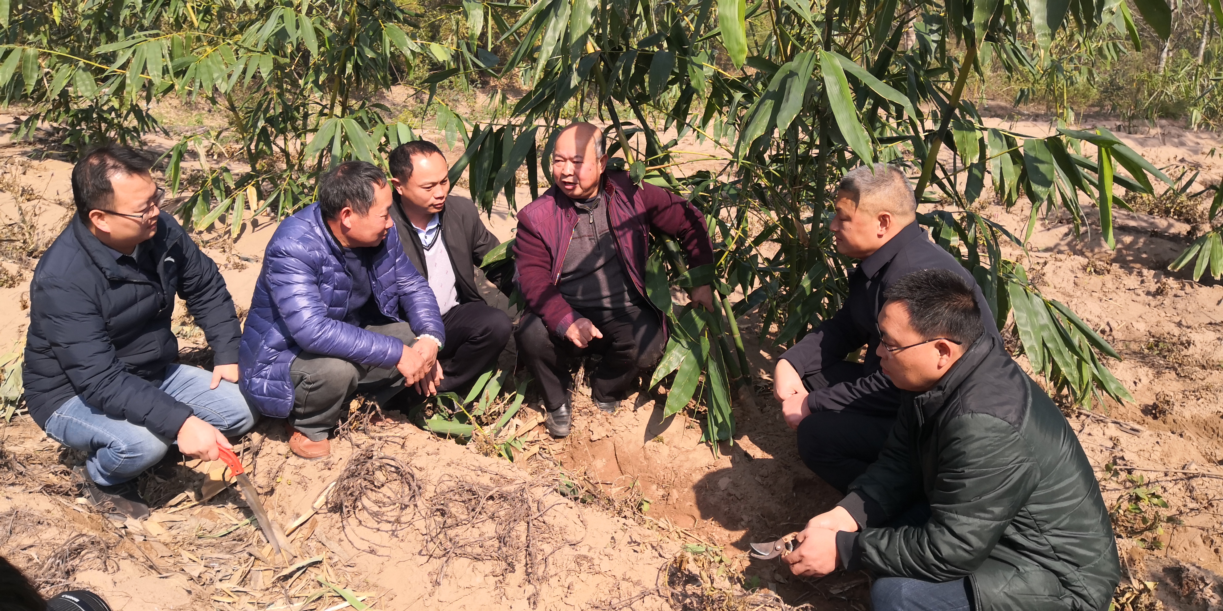 图3: 金宝乡党委书记倪发军(前左2)在笋用竹栽培示范基地认真学习其高产栽培技术。