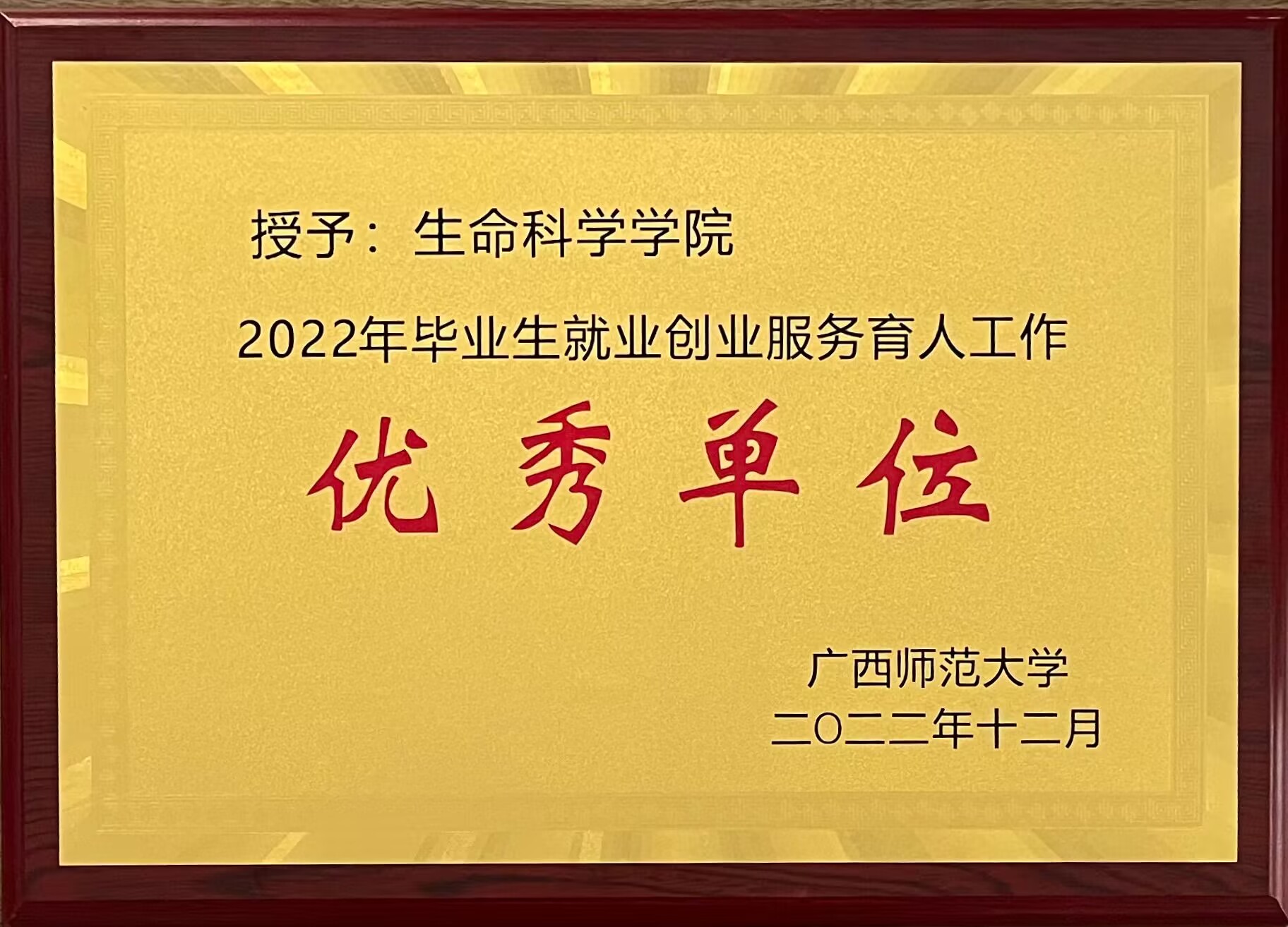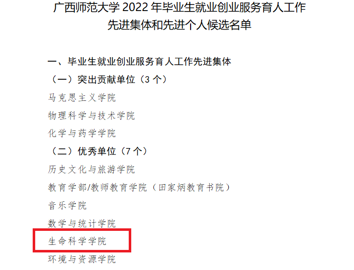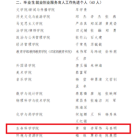 生命科学学院被评为广西师范大学2022年毕业生就业创业服务育人工作“优秀单位”;学院黄倩、李军伟、马姜明三位老师被评为“广西师范大学2022年毕业生就业创业服务育人工作先进个人”。