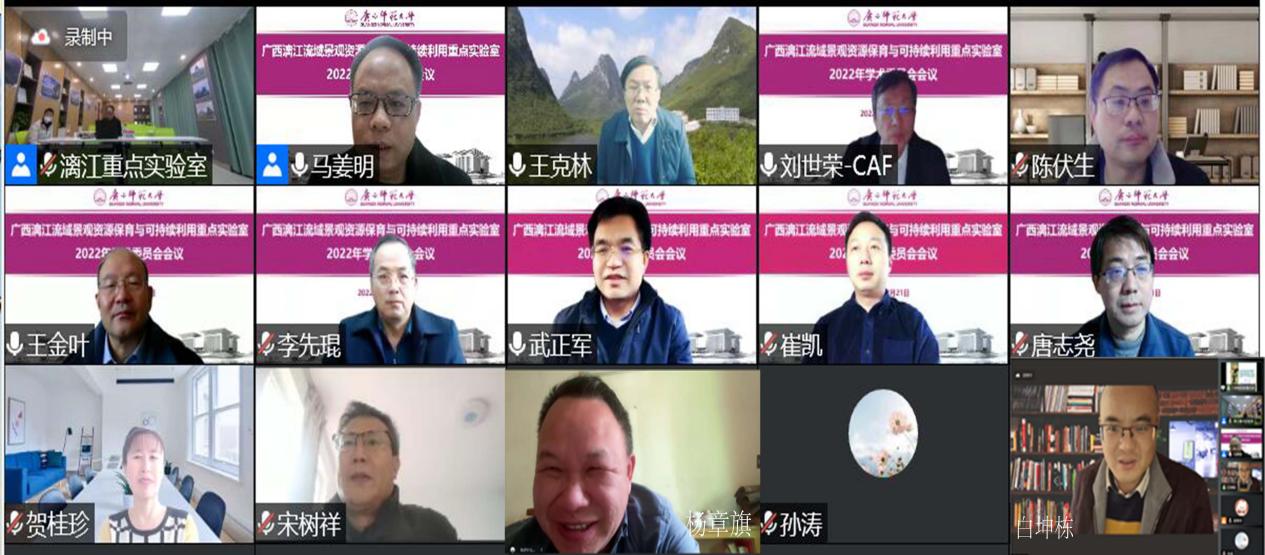 2022年12月21日,广西漓江流域景观资源保育与可持续利用重点实验室(以下简称“重点实验室”)2022年学术委员会会议以线上腾讯会议的形式召开。重点实验室学术委员会主任刘世荣研究员等专家委员、广西师范大学苏桂发副校长、科技处相关负责人、生命科学学院负责人、重点实验室主任和学术骨干等40余人参加会议。