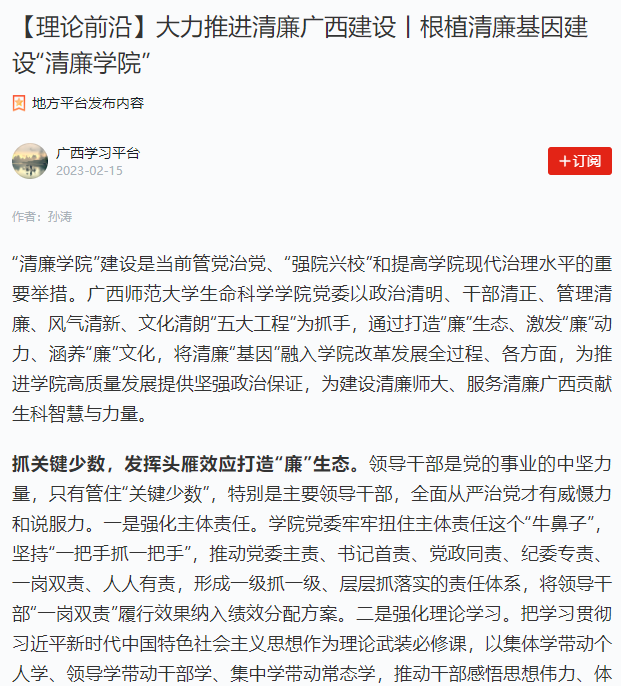 近日,《当代广西》以《根植清廉基因建设“清廉学院”》为题,刊登报道我校生命科学学院推进“清廉学院”建设经验做法,并获《学习强国》转载。
