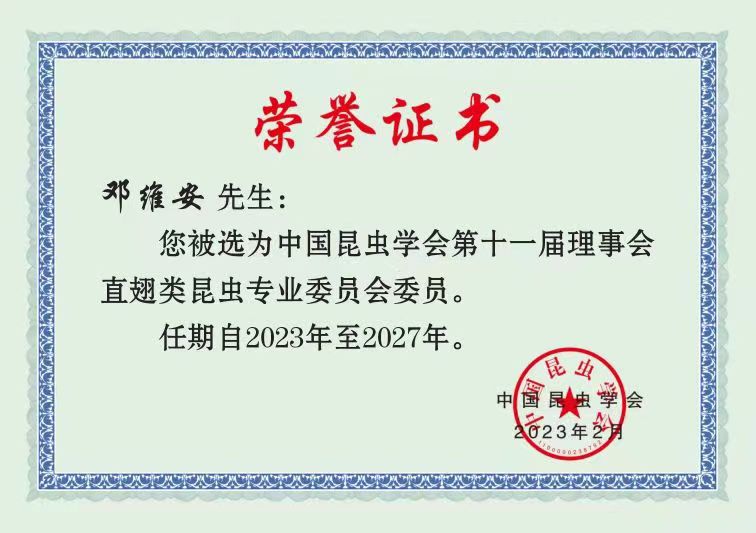 邓维安教授再次被中国昆虫学会选为理事会直翅类昆虫专业委员会委员,这是对邓教授长期以来在直翅类昆虫研究工作的认可,同时也将为学院相关学科的建设发展贡献力量。
