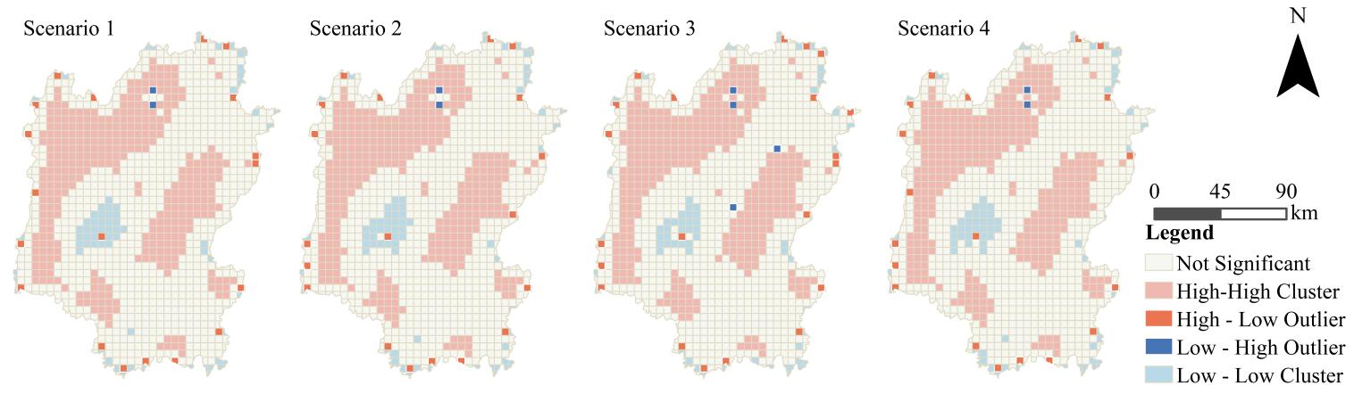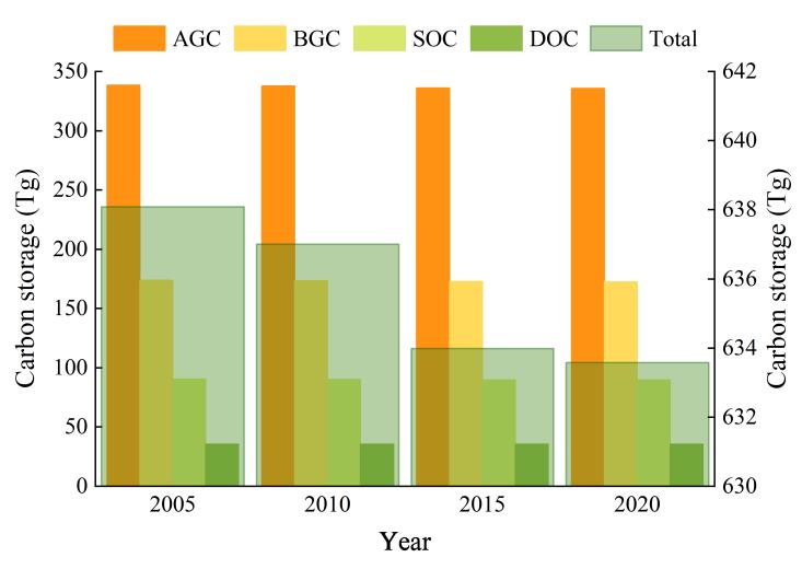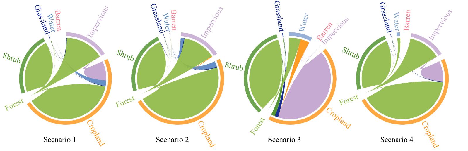 在可持续发展和双碳建设的背景下,为了量化桂林市碳储量及其时空分布特征,预测不同未来情景下的桂林市2035年碳储量情况,本研究面向SDGs8\11\15和桂林市可持续发展规划设置了自然发展、经济优先、生态优先和可持续发展四种未来情景。同时利用FLUS和InVEST模型以及GeoDa和ArcGIS软件建立土地利用变化与生态系统碳储量的耦合模型,来模拟/预测未来基于土地利用变化的生态系统碳储量分布和变化情况。结果表明:(1)2005-2020年桂林市土地利用类型以林地为主,耕地和建设用地不断扩张。2035年4种不同未来情境下林地均为重要转化类型;(2)2005-2020年桂林市西北部碳储量较高,碳损失区域要大于碳增加区域。2035年生态优先情景的碳储量最高,达874.76×106t。地上部分碳储量(ACG)是桂林市最主要的碳库。碳储量高的地区大多位于桂林市西北部和东北部。无论什么情景,主城区碳储量都维持在一个较低水平;(3)2035年桂林市碳储量分布具有较强的空间正相关,热点区域多于冷点区域。碳储量高值区集中在西北部和东部,低值区集中在桂林市区。本研究利用模型模拟计算未来基于土地利用变化的生态系统碳储量,进而寻求“双碳”目标导向下的土地利用转型最优解,为桂林市国家可持续发展议程创新示范区建设,以及在“双碳”目标导向下桂林市作为低碳、净零碳城市先行区的国土空间规划提供科学依据。