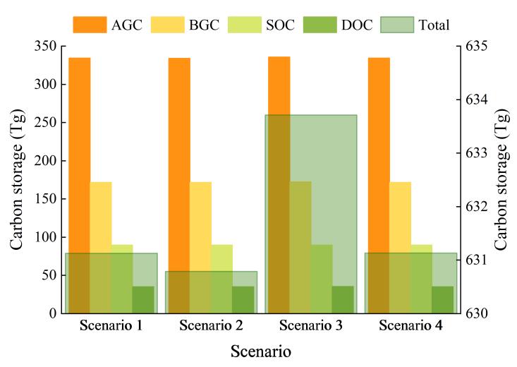 图2 2005-2020年基本碳库碳储量变化 图3 2035年不同未来情景基本碳库碳储量