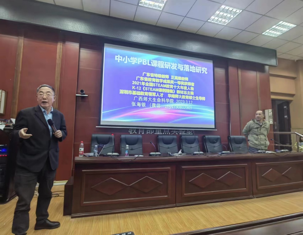 2023年3月12日晚,生命科学学院在伯康楼112教室成功开展《中小学FBL课程的开发与落地》讲座,本次讲座特邀广东省正高级教师、深圳市坪山区首任教科所所长张海银老师作主讲。学院教授陆祖军主持会议,2020级生物科学专业全体学生共同参加。