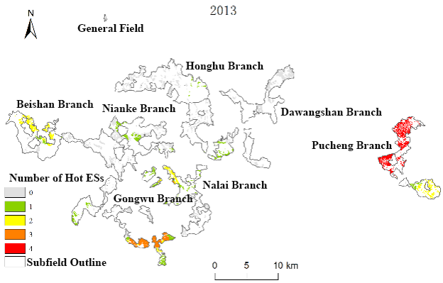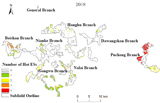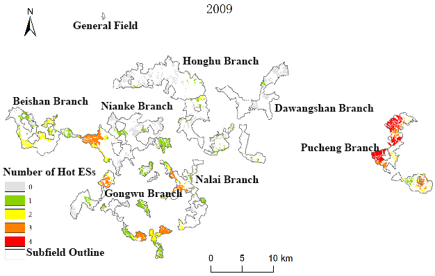 图1 2009-2018年广西派阳山林场马尾松人工林热点生态系统服务数量