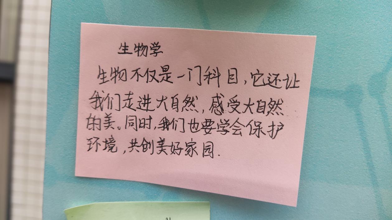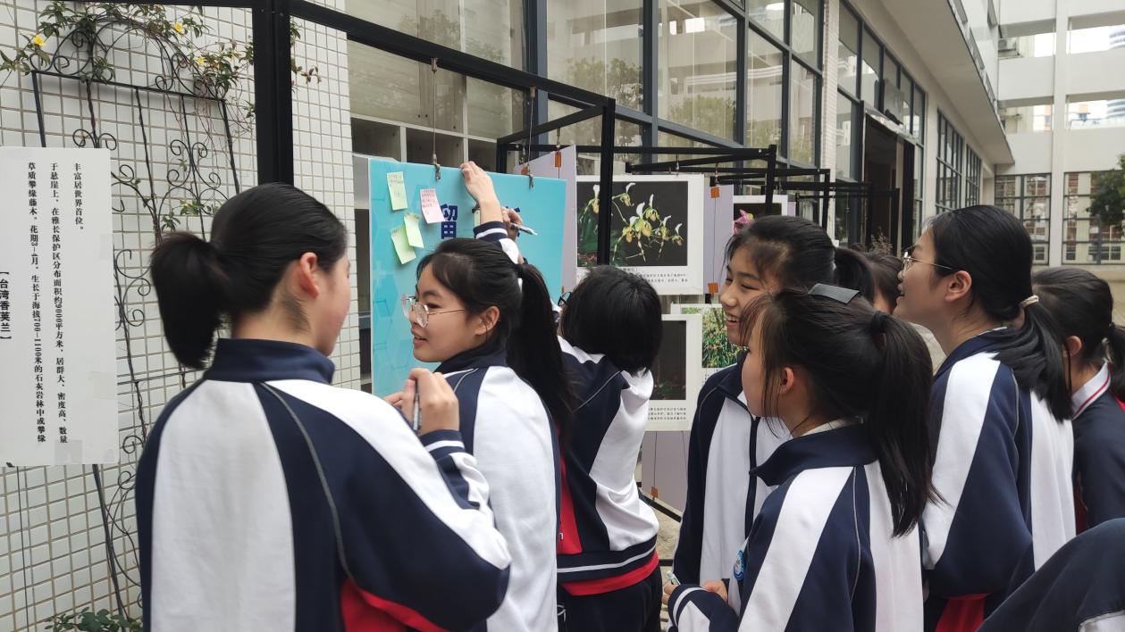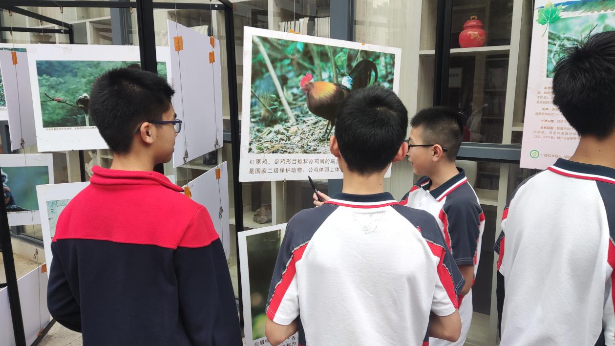 同学们被“科普长廊”里各具特色的图片所吸引,认真阅读每张图片的物种信息和保护等级,并进行热烈讨论。对广西特色物种、生物多样性的一些知识和保护意义有了更深入的认识。参观结束后,同学们纷纷在展览留言墙上写下自己的认识和看法,表达了对自然科学的敬重以及生物学习的热忱。同时,也对家乡丰富的动植物资源感到自豪。