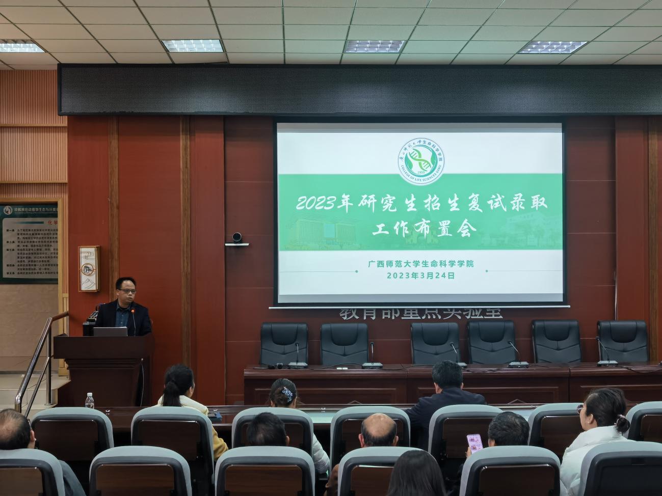 3月24日,生命科学学院2023年硕士研究生招生复试录取工作布置会议在雁山校区伯康楼112报告厅顺利召开,会议由学院分管研究生教育工作负责人主持,研究生招生工作领导小组、监督小组、复试小组成员、相关考务人员等近30人参加会议。