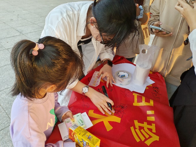 同学们参与节约用水横幅签字活动