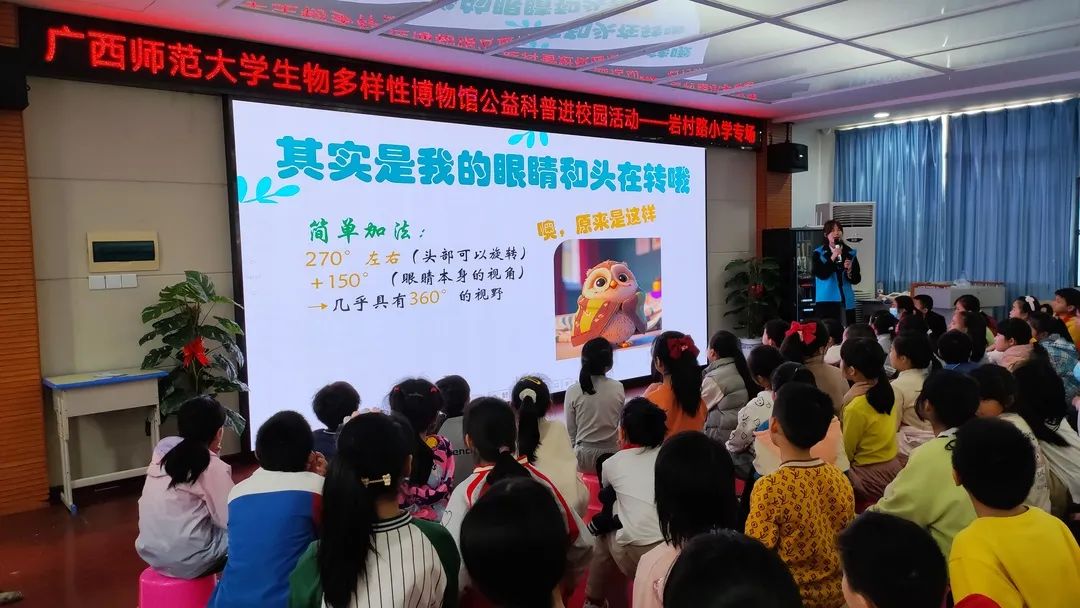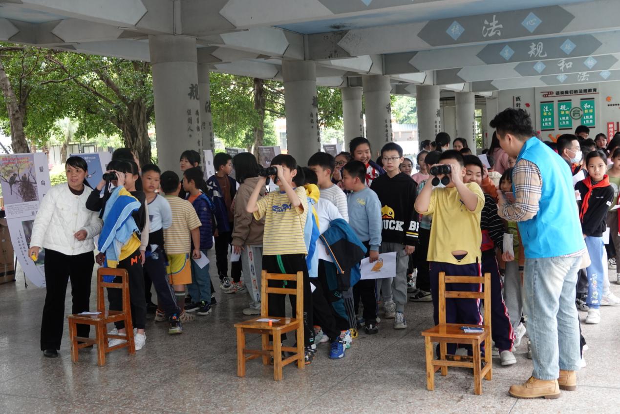 在岩村路小学,博物馆的学生志愿者为孩子们做了以“爱鸟周”为主题的科普活动。室内爱鸟主题科普课堂引领大家学习爱鸟知识,领悟习近平生态文明思想,带领同学们畅谈生态梦想。室外“一起来科普”爱鸟主题活动,观看广西分布鸟类相关图片和知识;教学生使用观鸟设备望远镜;展示珍稀濒危鸟类的邮票;开展相关知识的游戏等寓教于乐的方式,将爱鸟护鸟知识教授给学生,培养学生们的动物保护意识。
