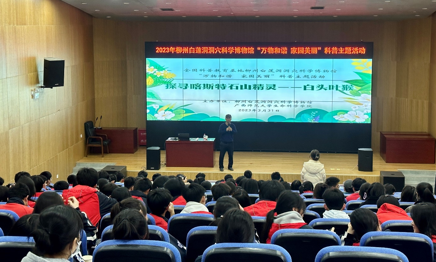 在柳州白莲洞洞穴科学博物馆,生科院周岐海教授为来自柳州文博系统和柳州民族高中的师生共150余人作了题为“探秘喀斯特石山精灵—白头叶猴”的科普报告,和大家分享了20多年来,在研究和保护白头叶猴等珍稀濒石山灵长类动物的科学探索中,发生的精彩故事。为听众们揭开“石山精灵”的神秘面纱,分析了人类活动对这些濒危物种存活的影响和它们的保护现状,展示了他的研究成果,传达了“促进人与自然和谐共生”的愿望。
