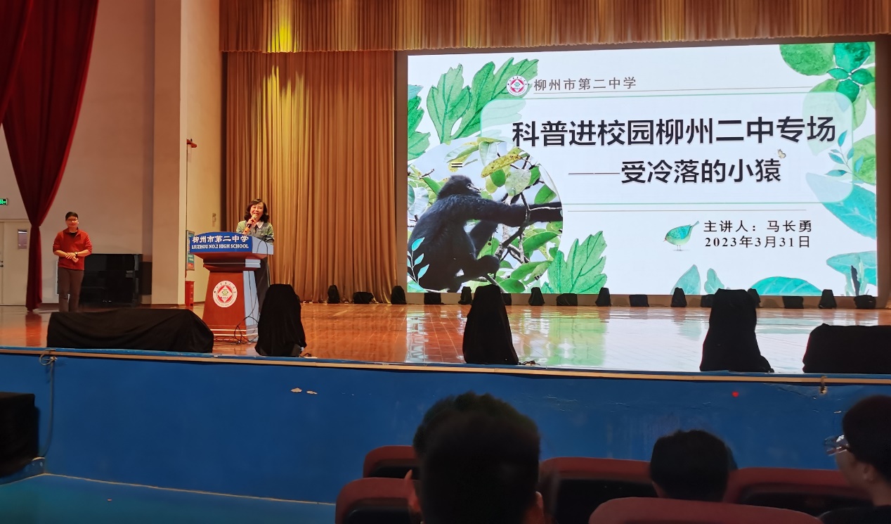 在柳州市第二中学,生科院马长勇博士进行了一场生动、精彩并充满意义的讲座——“受冷落的小猿”。他向同学们科普了猿的种类、分布、行为和濒危机制,同学们感受到了生态保护的迫在眉睫,明白保护濒危动物、保护自然生物多样性的重要意义。