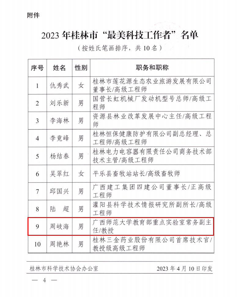 近日,桂林市委宣传部与市科协、科技局、工信局、市农业农村局等五部门联合发文,公布了2023年桂林“最美科技工作者”选树活动结果。我校生命科学学院周岐海教授荣膺2023年桂林“最美科技工作者”荣誉称号,广西壮族自治区科学技术协会副主席刘家凯颁发证书。